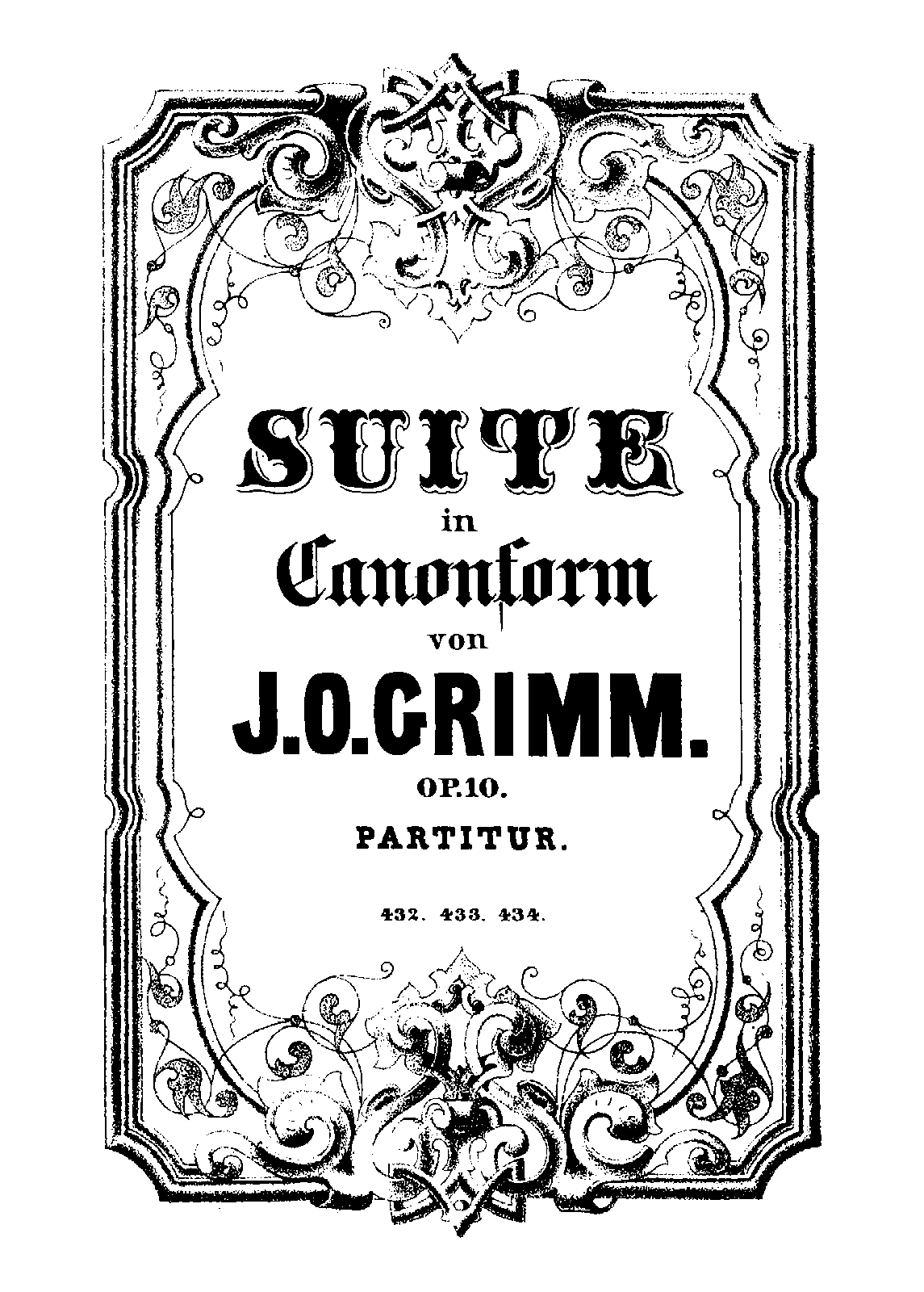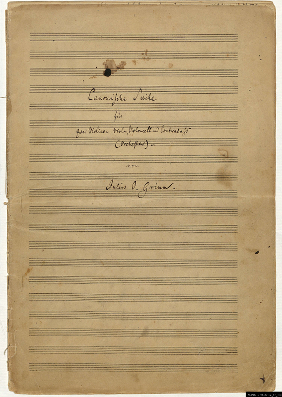 | Alternative. Title | Suite in Canonform für 2 Violinen, Viola, Violoncell und Contrabass (Orchester) componirt von Julius O. Grimm. Op. 10. |