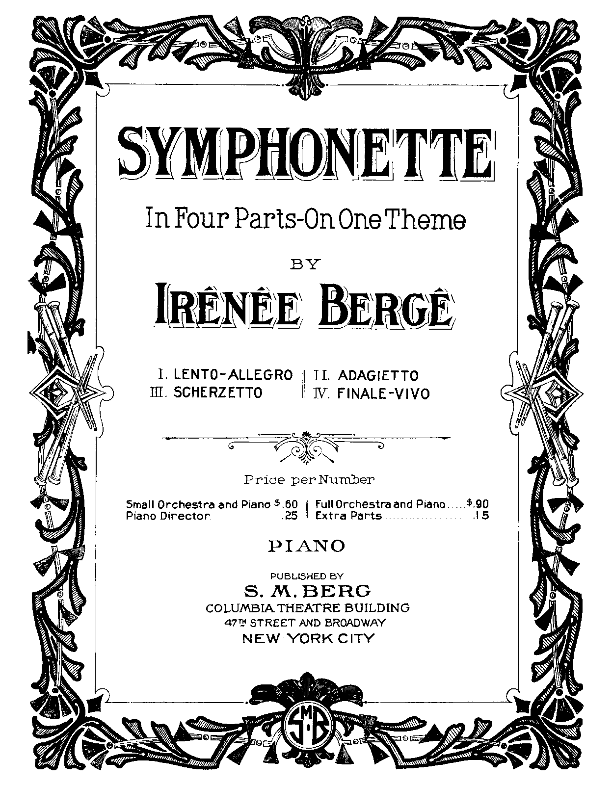 As with scores published in Berg's Incidental Series works in Berg's Concert Series and Descriptive Series were typically scored for an orchestra consisting of the following: flute, oboe, 2 clarinets, bassoon, 2 horns, 2 cornets (or trumpets), trombone, timpani, percussion, piano, and strings. Through the use of cross cueing the works could also be performed by a reduced-sized orchestra typically consisting of the following: flute, clarinet, 2 cornets (or trumpets), trombone, timpani, percussion, piano, and strings. The parts used for both sizes of orchestra were identical. Also, the piano parts were written so that they could serve as a solo piano arrangement.