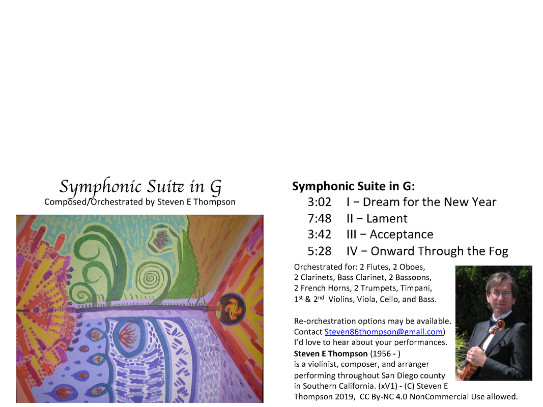 Symphonic Suite in G was inspired by the hope felt as a new year starts, flavored by memories of past hopes, sometimes failed, and the reconciliation process enabling us to move ahead through whatever challenges the future may bring.
