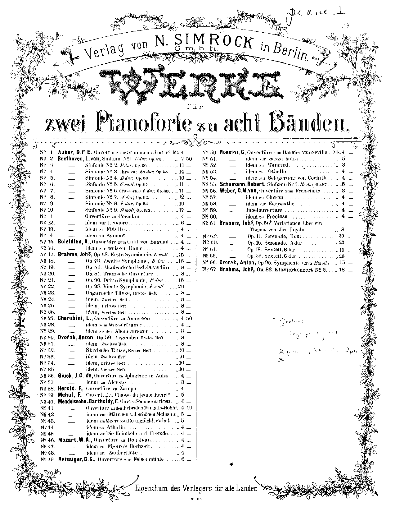 Publisher. Info. Berlin: N. Simrock, n.d.(ca.1891). Plate 9409.