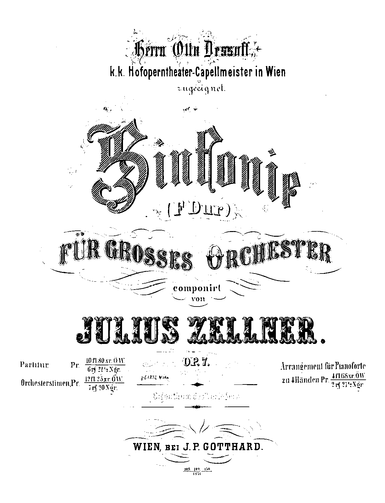 The Library of Congress (Washington, DC) may have a full score of this work (catalog entry - but note the "unk" uncertainty in the cataloguing; sometimes they do have items under "unk", sometimes, not. Worth checking, if only to get additional information about the work (instrumentation list?). The Austrian National Library does have a full score, 159 pages, plate J.P.G.148. (A search on Julius Zellner in the ONB music catalogue gives about 4 dozen "hits", though some are works by Hermann Zellner published by a publisher whose name contains Julius :) A more specific search gives only 18, but that's still good, and includes chamber music, his op.12 piano concerto, etc.) There is also a copy of this work in full score at Basel Musik-Akademie, and a downloadable copy at Google Books.