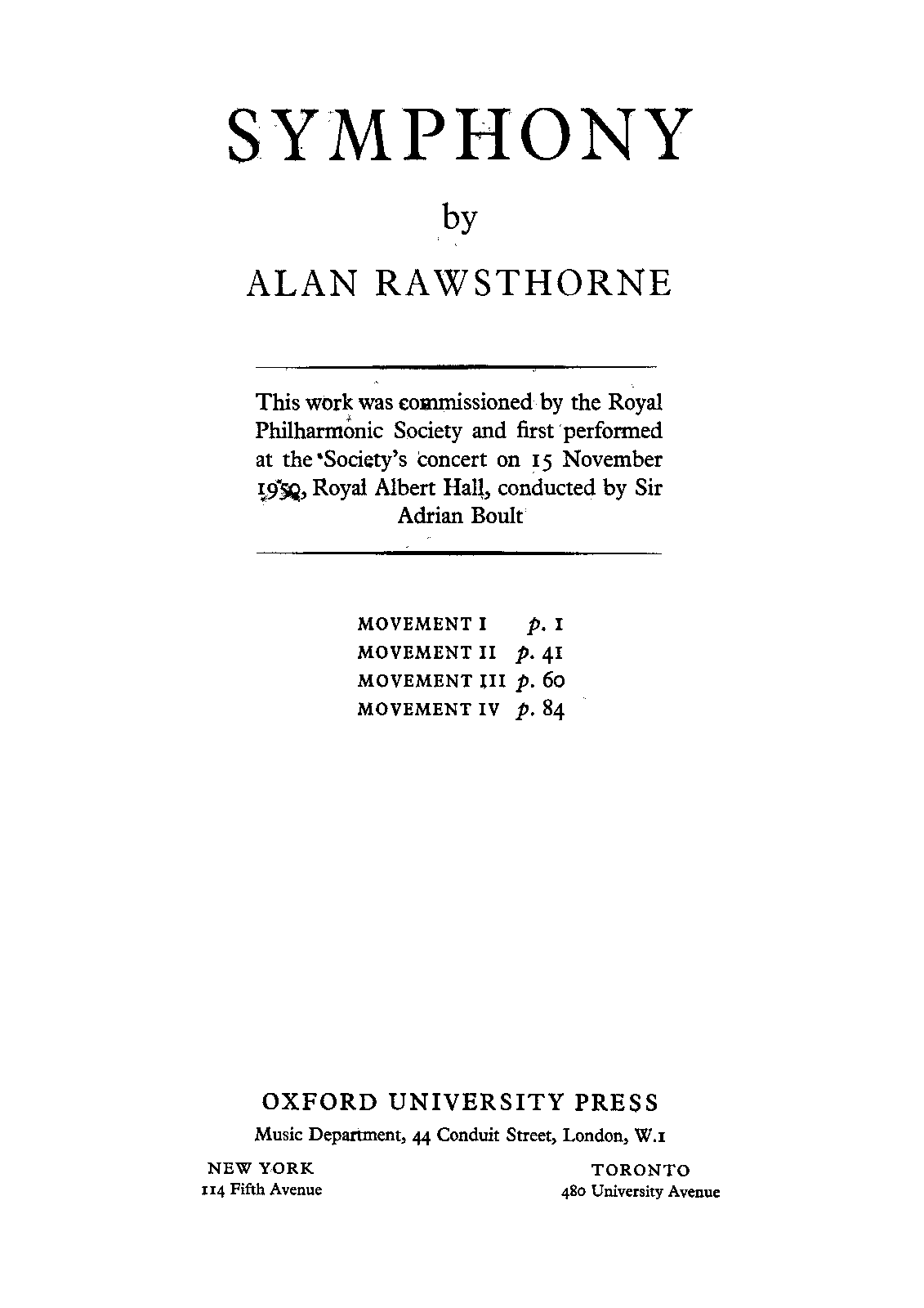 | Extra Information | Commissioned by Royal Philharmonic Society. One of the best symphonies Rawsthorne has composed. Having more classical-romanticism. -Sissel |