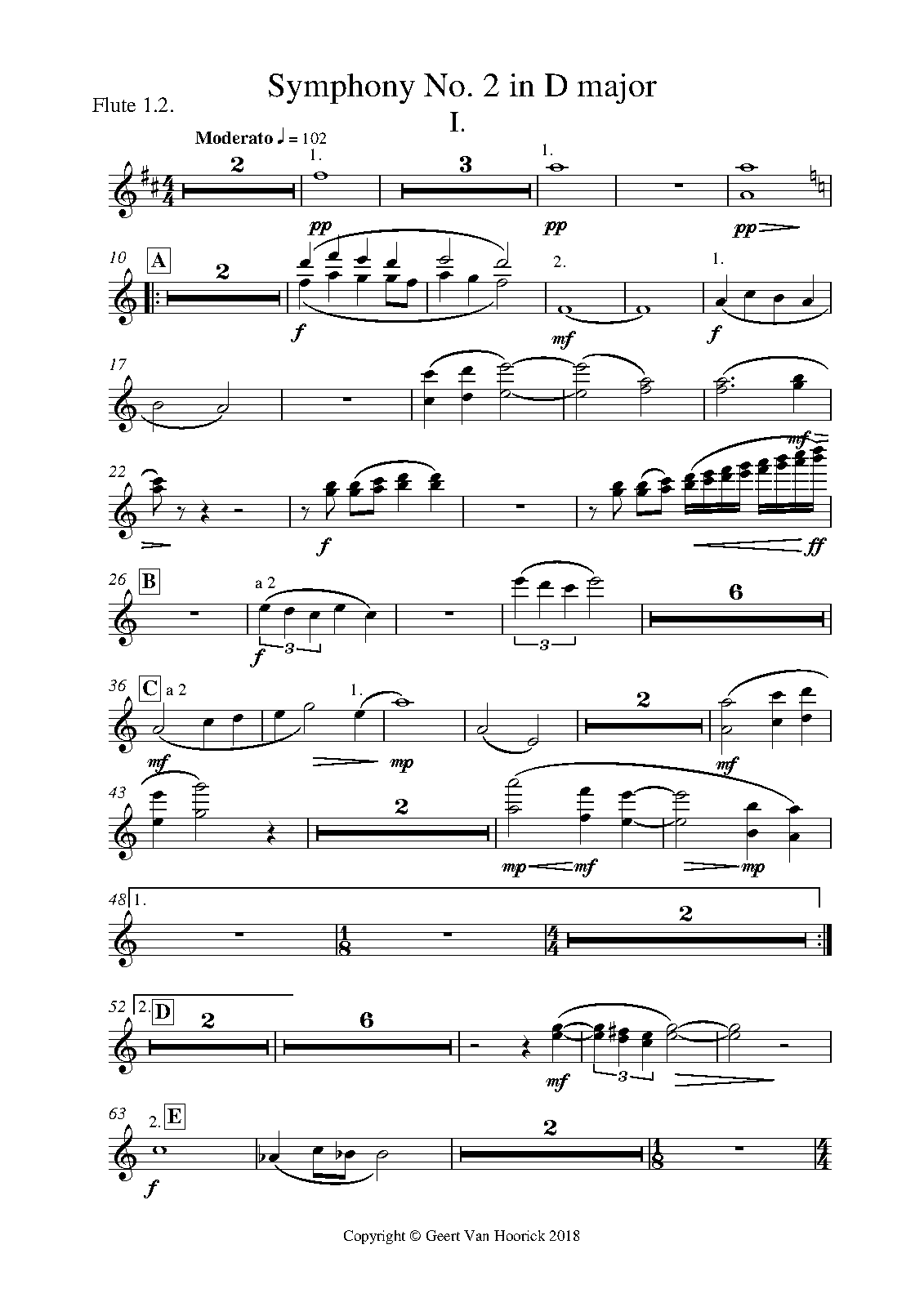 | Extra Information | The Symphony No. 2 is neo-romantic, pastoral and rather introvert. It is composed in the late romantic tradition, and is scored for a normal sized symphonic orchestra. It consists of four movements. The 1st one is a pastoral and moderately fast movement in sonata form, based on two related themes, in which a short fanfare plays also an important role. The exposition and reprise are largely in the Dorian mode, except from the short introduction in D major. The development section starts around 3’30”, the reprise starts around 7’00”. The 2nd one is a vigorous scherzo in D minor (in which the timpani and other percussion instruments play a major role) with a fairylike trio, that starts around 2’30”. The 3rd movement is a slow and moving cantilena in which the cello solo plays an important role, immediately expositing the singing main theme in B flat minor, that is then further developed (erratum in the score: bar 82 to 83 strings except basses must play the note slurred). The 4th one (or finale) is again a pastoral and moderately fast movement in sonata form, based on two themes; in de 2nd one a (longer) fanfare is dominant. The development section starts around 2’00”, the reprise starts around 4’00”. After the fanfare rings for the last time, a solemn coda in D major concludes the symphony. Digital performance using Sibelius 6 and Garritan Personal Orchestra. The parts of the 4th movement are not yet updated to the last version. Score moving videos on my YouTube channel. |