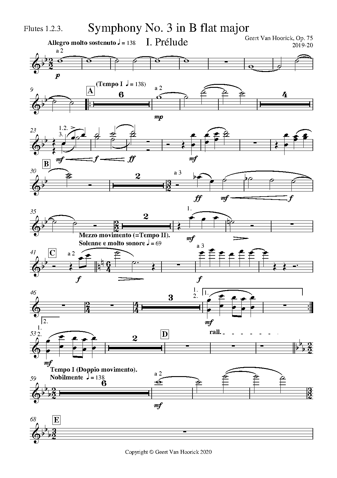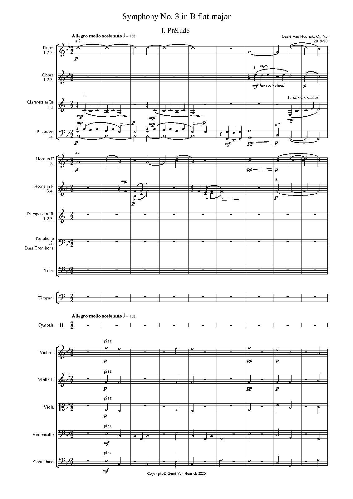 The Symphony No. 3 is neo-romantic and more extrovert and fiery in comparison with the second one. It is scored for a normal sized symphonic orchestra. It consists of five movements. The 1st one is a moderately fast movement in sonata form (but without reprise), based on two very distinct themes (the first quiet, pastoral and flowing, the second a solemn choral in a modal mode). The development section starts around 3’40”. The 2nd one is a lively fugue in B-flat minor, largely in 5/4. The fugue is based upon two themes (a vigorous first one and a singing second one again in a modal mode). In the exposition of the first theme the second theme is already brought in as countersubject, and after a short stretto this second theme gets further elaborated. After 1’45” the development of the two themes begins, firstly the first on its own, then both simultaneously, and after 3’50” the two themes (the first theme reduced to just the notes without rhythm) are further developed and combined leading to a climax accentuated with a cymbals crash. The 3rd movement, in the same key, replaces the (in comparison with the other two symphonies) usual scherzo but is likewise constructed (ABA’). Graciousness and kindness are all around here, as well as some beautiful solos, especially for the English Horn around 0’35”. The 4th movement is a slow and solemn choral, in D major. After 2’25” precious moments happen beginning with the inversion of the main theme in the strings combined with a derived flute solo. The 5th one (or finale) is an fiery up-tempo piece in sonata form, with a substantial role for the percussion. The development section starts around 2’15”, a short solemn coda concludes the symphony. Digital performance using Sibelius 6 and Garritan Personal Orchestra. Score moving videos on my YouTube-channel.