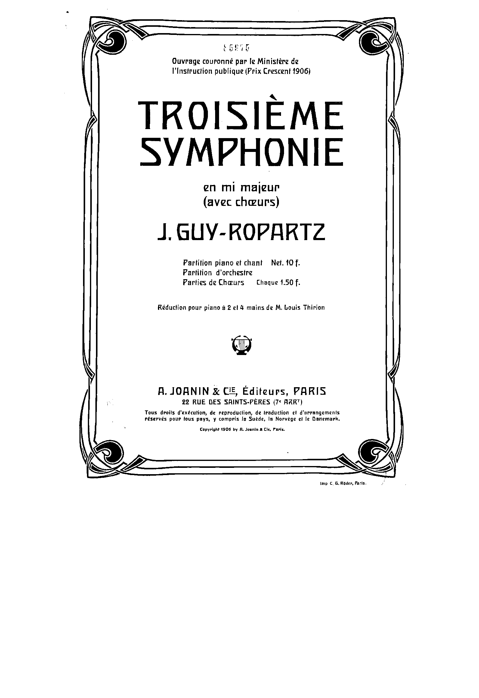 Vocal score published in 1906. Publication noted in the Bibliographie de la France 2e série, 95e année, Nº 45, 10 Novembre 1906, p.670, r.5023.