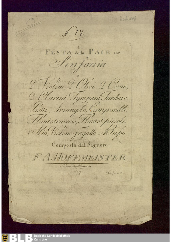 | Alternative. Title | La Festa della Pace 1791 Sinfonia a 2 Violoni, 2 Oboi, 2 Corni 2 Clarini, Tympani, Tamburo, Piatti, triangolo, Campanelli, Flauto traverso, Flauto piccolo, Alto, Violonc: Fagotto e Basso |