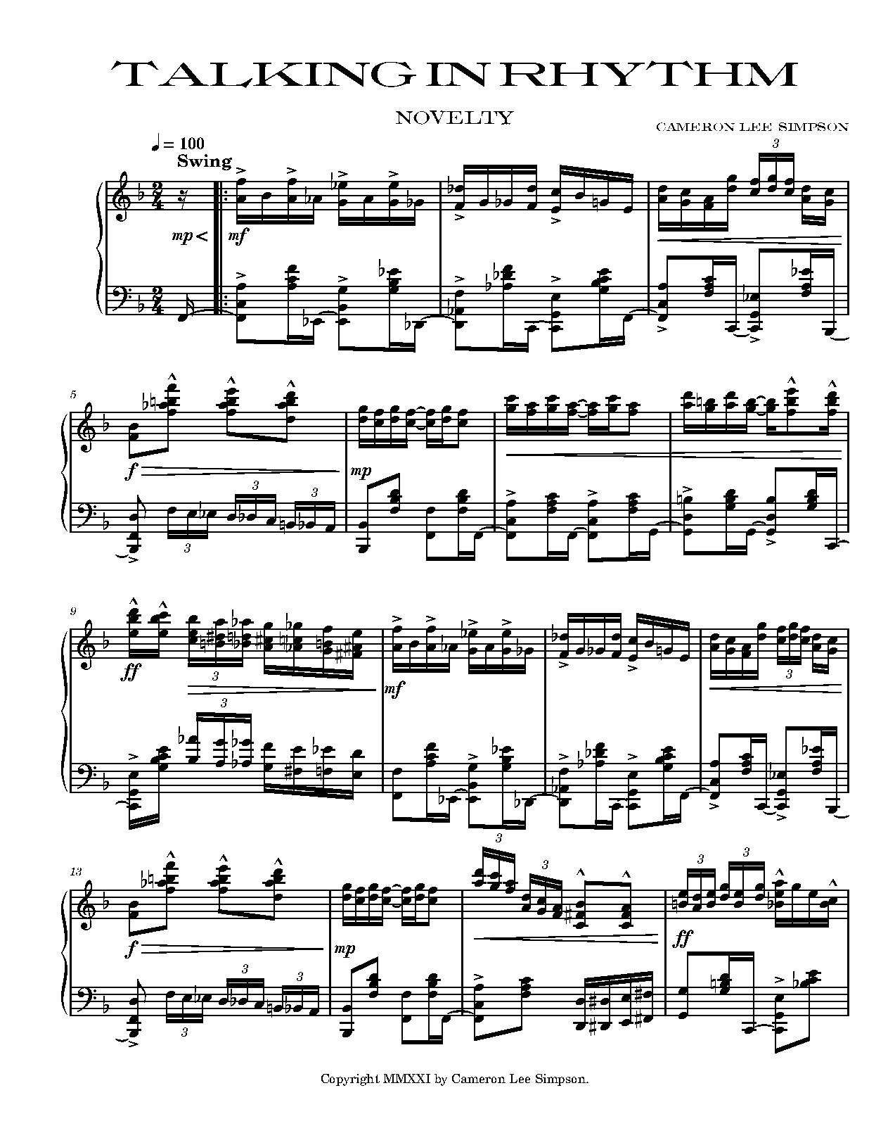 | Extra Information | This is one of the hardest novelty piano pieces I've made yet. This one actually had the title come to me in my head as I wanted a really nice but difficult novelty piece with me and then I made up Talking In Rhythm on the spot. I wanted something Rhythm and then Talking In Rhythm came to me haha. |
