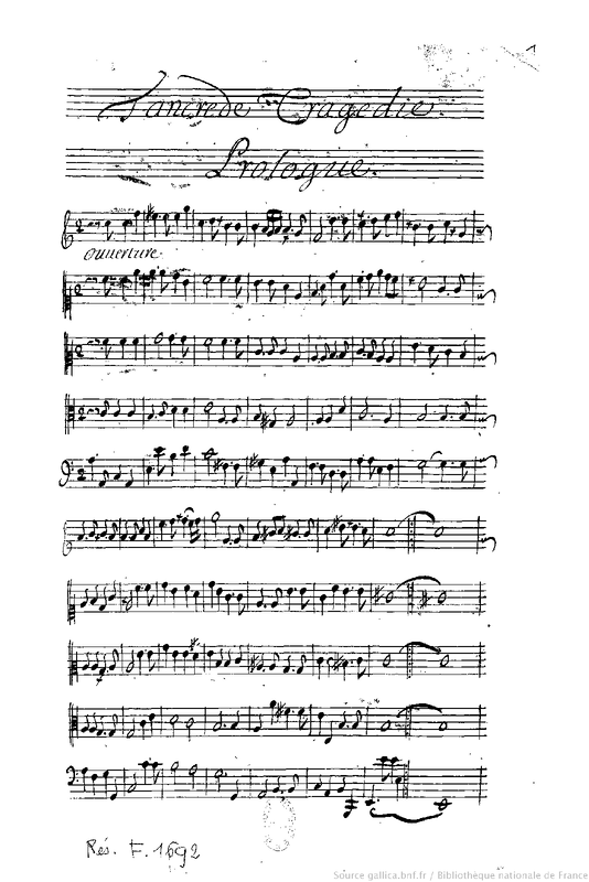| Instrumentation | Voices: l'Enchanteur (C3), la Paix (C1), Argan (F4), Hermine (C1), Isménor (F4), Clorinde (C1), Tancrède (F4), une Guerrière (C1), 2 Amazones (G2), Ormond (C3), Herminie (C1), un Plaisir (C3), 2 Driades (G2, C1), la Vengeance (C4), un Guerrier (C4); mixed chorus (SATB) : G2, C3, C4, F4 Orchestra: G1, C1, C2, C3, F4 (Mentions d'instrumentation sous la musique : flûtes (2), petites flûtes, flûtes allemandes, trompettes (2), bassons) |