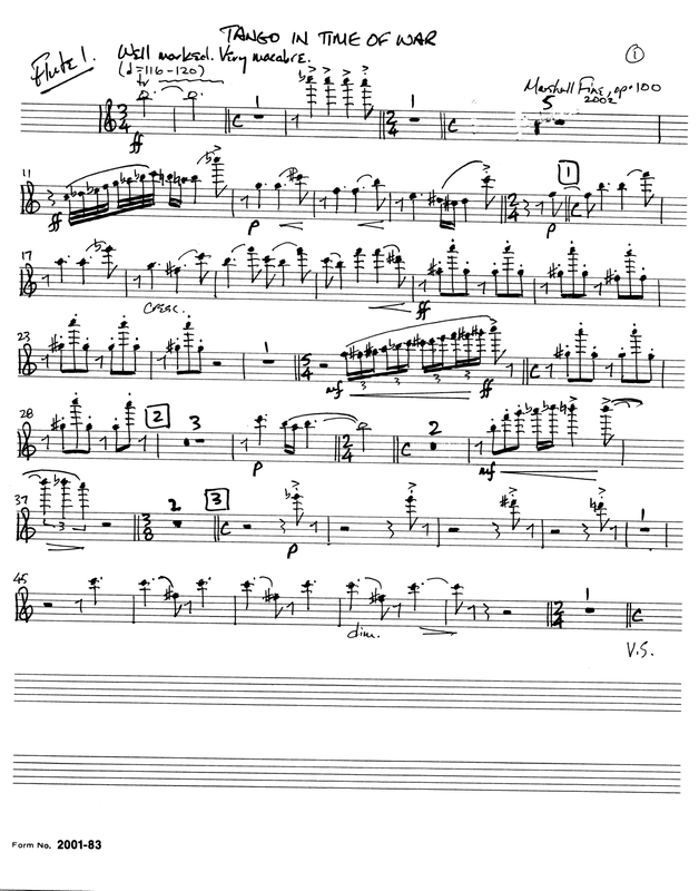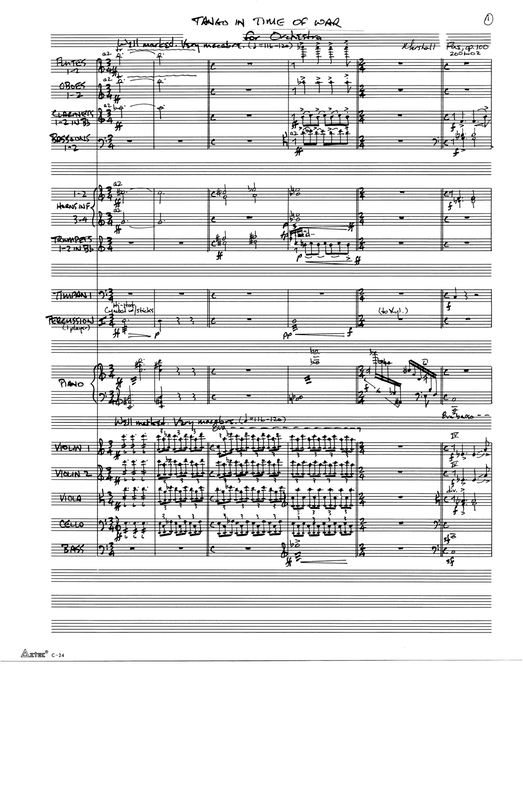 The Tango in Time of War is actually the first-fruits of Fine’s discovery of tango writing, which Fine would continue in the next two works (Milagro del Amor and Milonga Para Salina) and would also have used for the finale of the mature Viola Concerto had he completed it. Elements of the tango are also present in the dirge-like coda for the slow movement of his sketched-out Fourth Symphony. Fine’s acquaintance with the tango style can be accurately dated to the summer of 2001, when Penn’s Woods’s new Music Director Gerardo Edelstein did an all-tango program was played which included the Piazzolla Bandoneon Concerto. The bandoneon soloist, Raul Jaurena, praised Fine’s ability to play in the style de-spite his lack of acquaintance with it (his fluency in it was only indirectly derived from his youth as a rock musician).