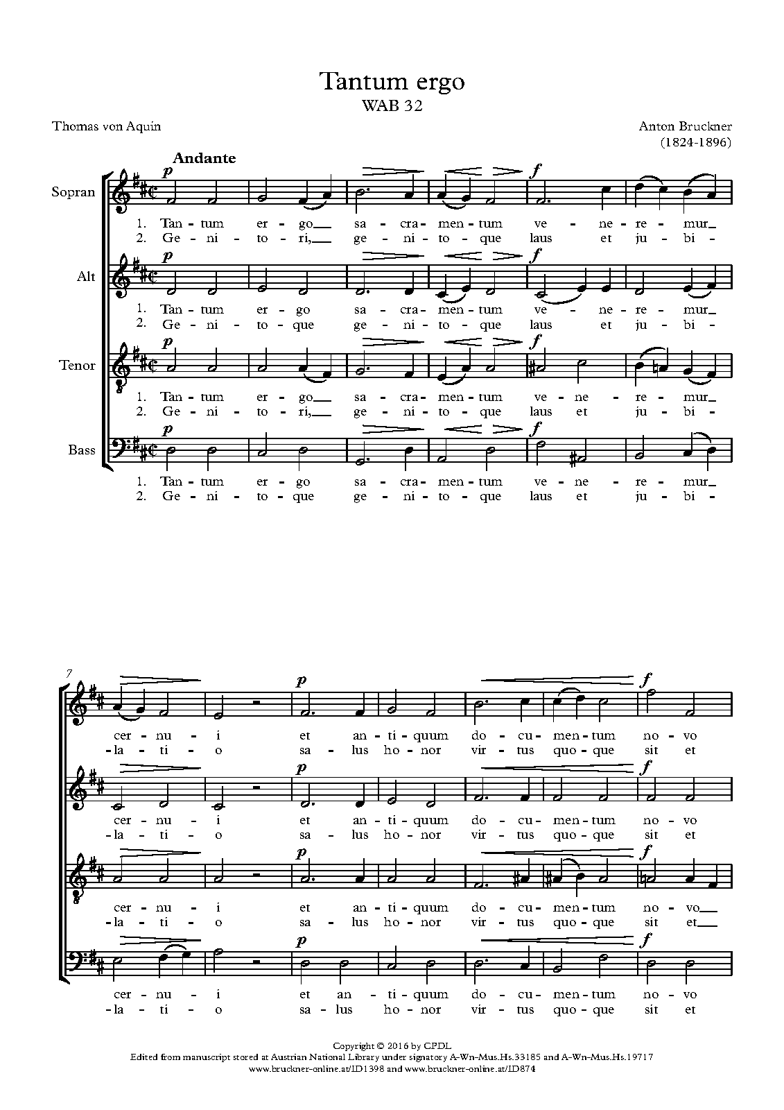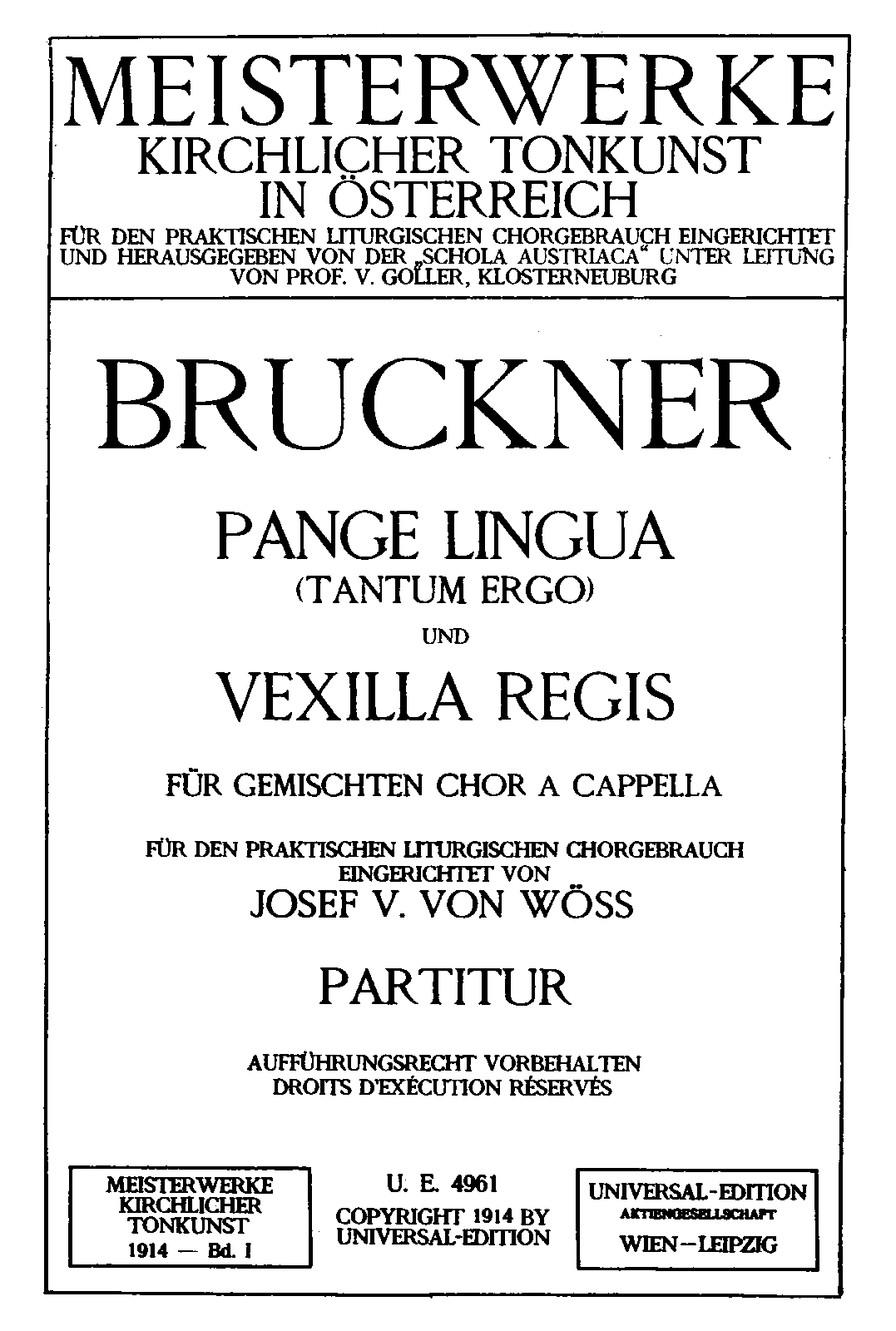 • Some sources have this piece as Pange lingua. The (incorrect) name Pange lingua is coming from the first edition by Joseph Venantius Wöß (1914). The by Bruckner composed Tantum ergo was then issued as the not-composed first strophe of the hymn, i.e., Pange lingua and was classified by Grasberger as "Pange lingua, WAB 32" (between Pange lingua, WAB 31 and Pange lingua, WAB 33).