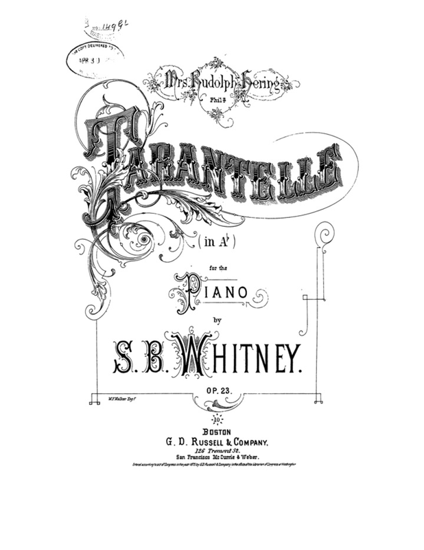 No.2 from 32278011450834: Tarantelle, Charles H. Templeton, Sr. sheet music collection. Special Collections, Mississippi State University Libraries (citation by request). Ditson edition not exactly a reprint- there are new fingerings throughout, but the basic print is the same as is the style of certain kinds of marks ("con fuoco", "Ped.") suggesting the fingerings have been printed on the Russell edition rather than a new one made, and the plates adjusted (if that can be done?) rather than new ones made.