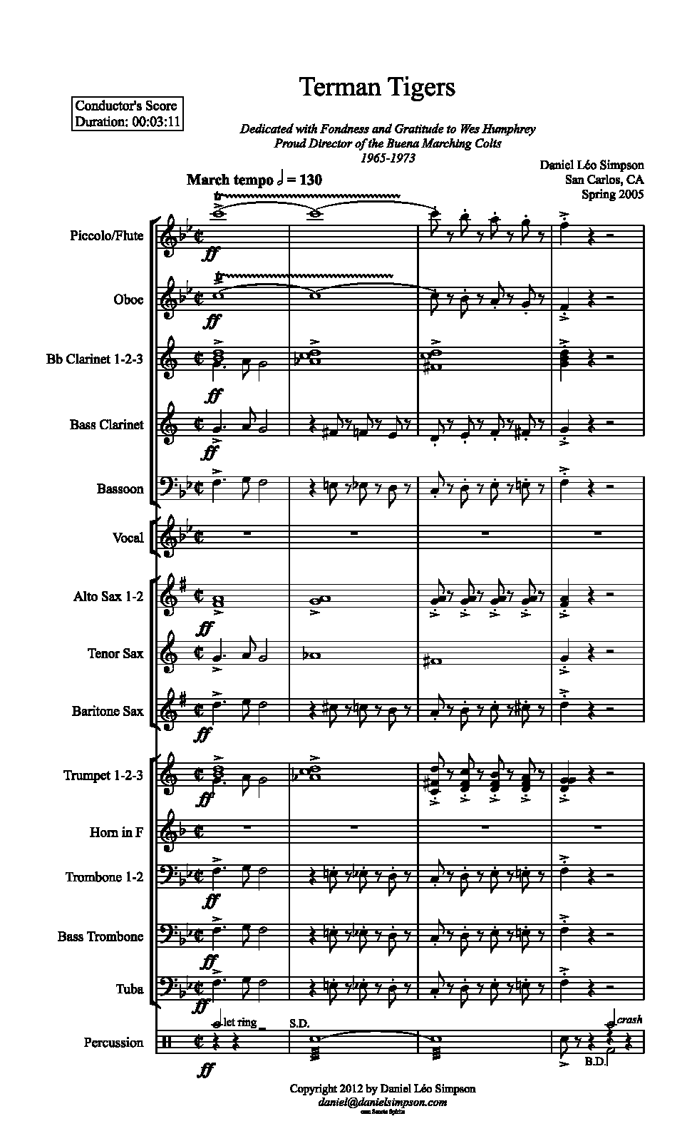 ⇒ 9 more: Oboe • Clarinet 1, 2, 3, Bass Clarinet (B♭) • Bassoon • Vocal • Alto Sax 1, 2, Tenor Sax, Baritone Sax • Trumpet 1, 2, 3, (B♭) • Horn in F • Trombone 1, 2, Bass Trombone, Tuba • Percussion (Cymbals, Snare Drum, Bass Drum)