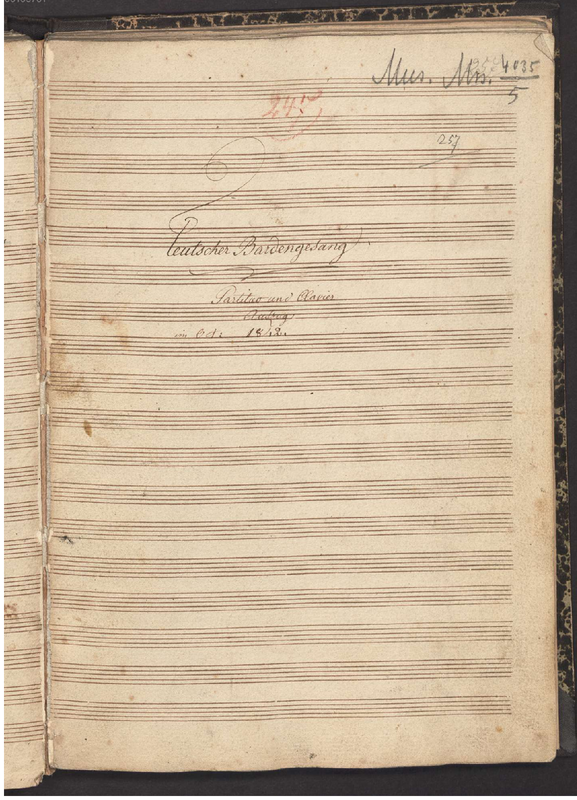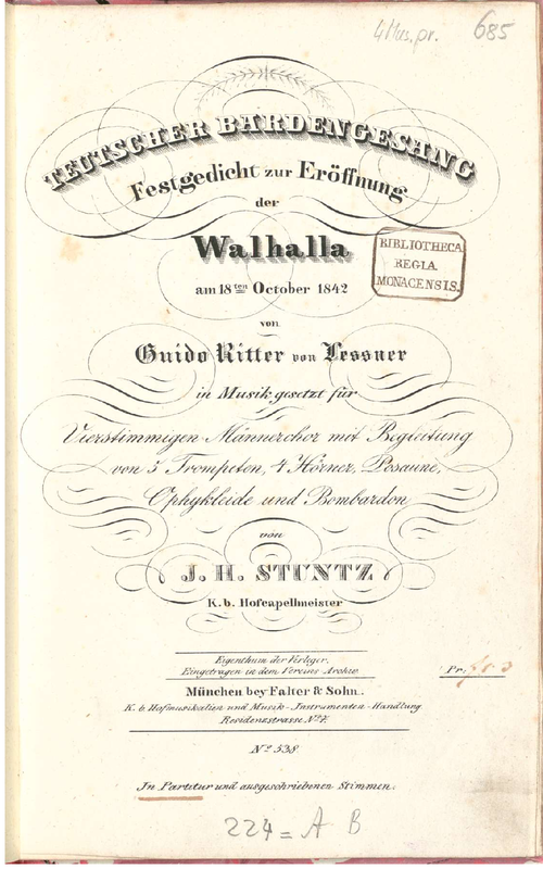 Teutscher Bardengesang. Festgedicht zur Eroffnung der Walhalla am 18ten October 1842 ... in Musik gesetzt für Vierstimmigen Männerchor mit Begleitung von 5 Trompeten, 4 Horner, Posaune, Ophykleide und Bombardon von J. H. Stuntz