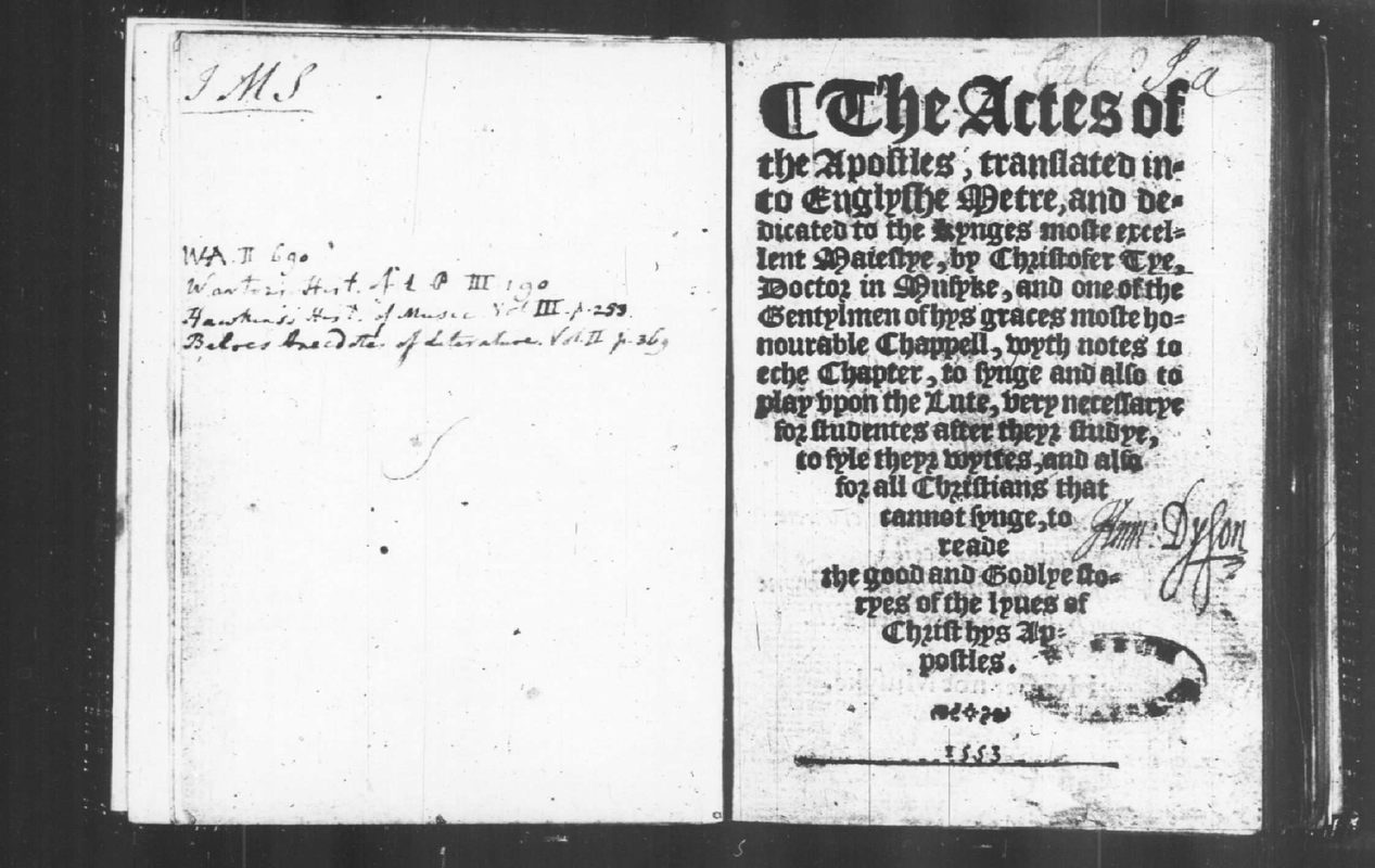 | Alternative. Title | The Actes of the Apostles, translated into Englyshe Metre, and dedicated to the kynges most excellent Maiestye, by Christofer Tye, Doctor in Musyke, and one of the Gentylmen of hys graces moste honourable Chappell, wyth notes to eche Chapter, to synge and also to play vpon the Lute, very necessarye for studentes after theyr studye, to fyle theyr wyttes, and also for all Christians that cannot synge, to reade the good and Godlye storyes of the lyues of Christ hys Appostles. |