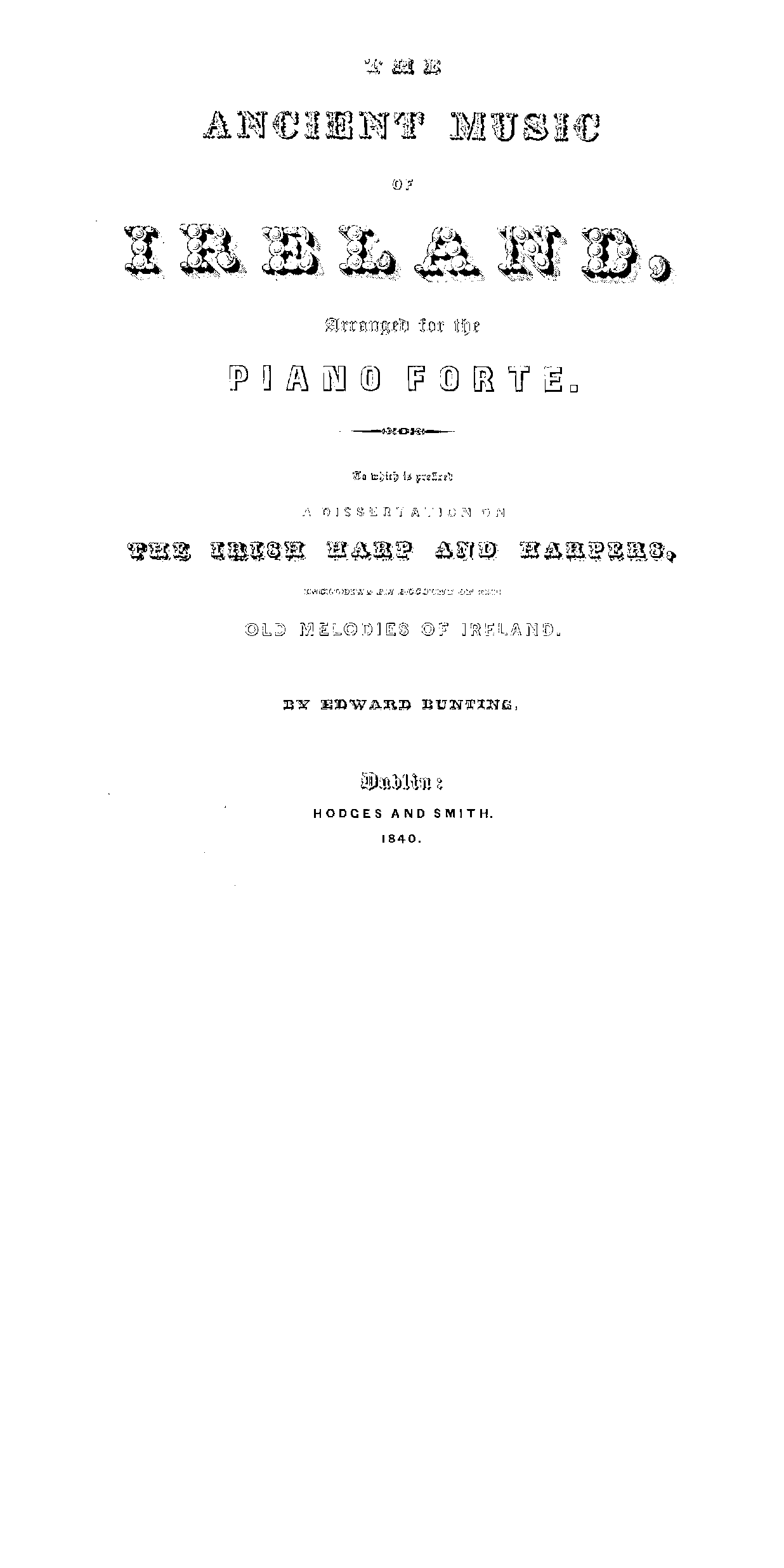 Full descriptive title: The Ancient Music of Ireland, Arranged for the Piano Forte, To which is prefixed a Dissertation on the Irish Harp and Harpers, Including an Account of the Old Melodies of Ireland