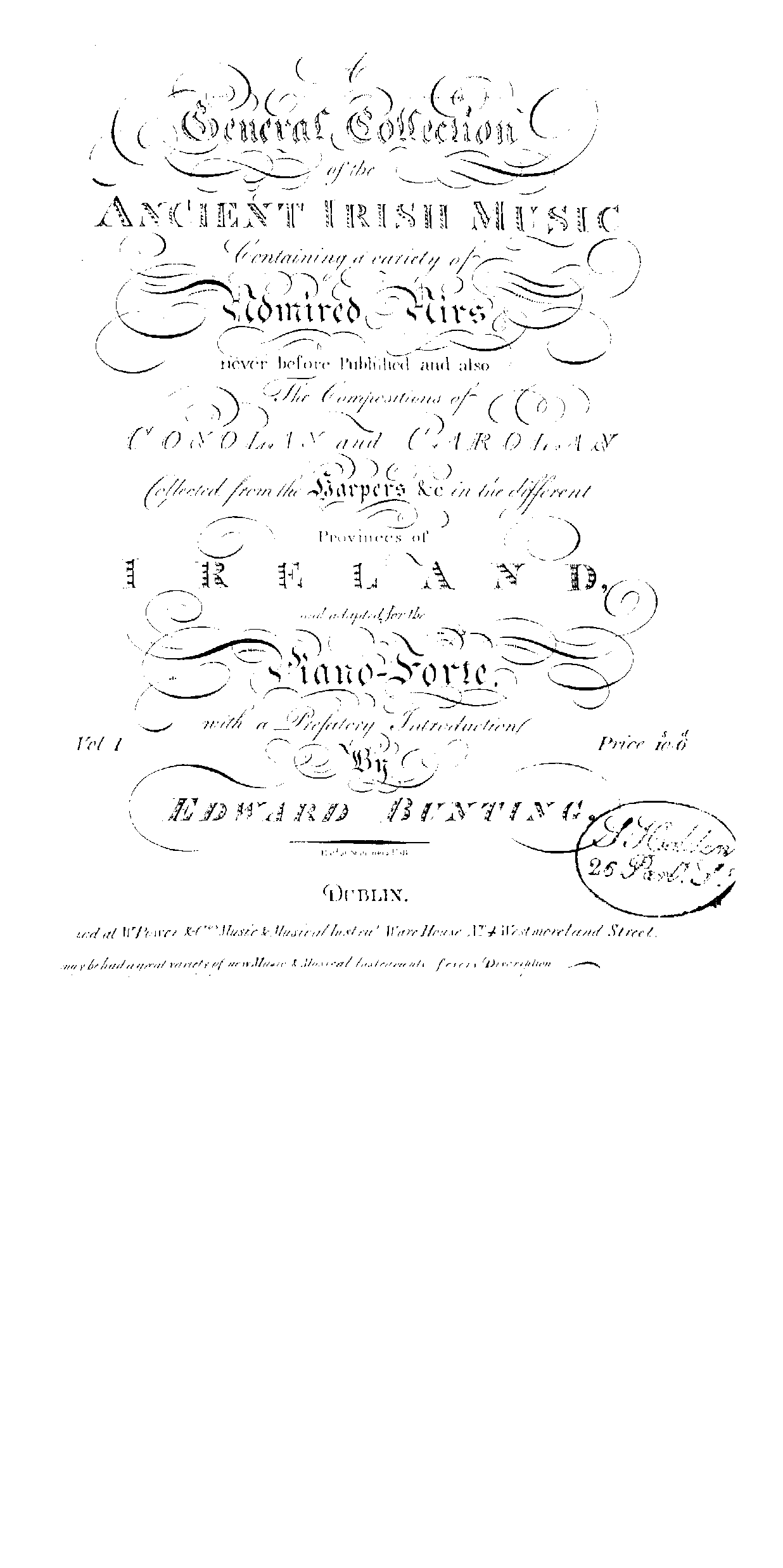 Full descriptive title: A General Collection of the Ancient Irish Music, Containing a Variety of Admired Airs never before Published and also the Compositions of Conolan and Carolan, Collected from the Harpers &c. in the different Provinces of Ireland, and adapted for the Piano-Forte