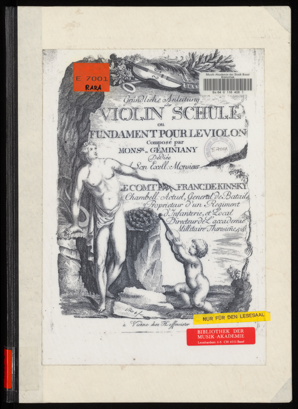 Differs from the the original to a considerable extent, both removing and adding material. In fact there is probably less material by Geminiani here than by the anonymous editor. Most noticeable are the 24 'Gammes' (scales) for 2 violins (in a similar manner to Baillot's Methode) and the 12 duos; however some of Geminiani's 'Compositions' for violin & continuo, and a few of the 'Essempii/Exemples' are retained. Title: L'Art du Violon ou Méthode Raisonnée pour aprendre a bien jouer de cet Instrument. Composéee primitivement par le Célébre F. Geminiani, et nouvellement Redigée, Augmentée, Expliquée et enrichie de nouveaux exempler, Préludes, Airs et Duos gradués pour éclaircir et faciliter l'instruction et mettre évidement en pratique les principes de cet excellent maitre. Nouvelle édition. Mise au jour d'apres les Conseils, les Soins, les Exemples et les productions des plus habiles maitres de Violon, Francais, Italiens et Allemans.