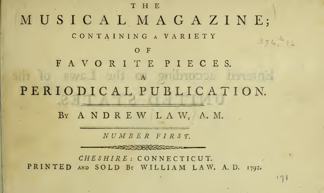 Cheshire, CT: [Andrew Law], 1800 Number 6th of Musical Magazine dated November 1801.
