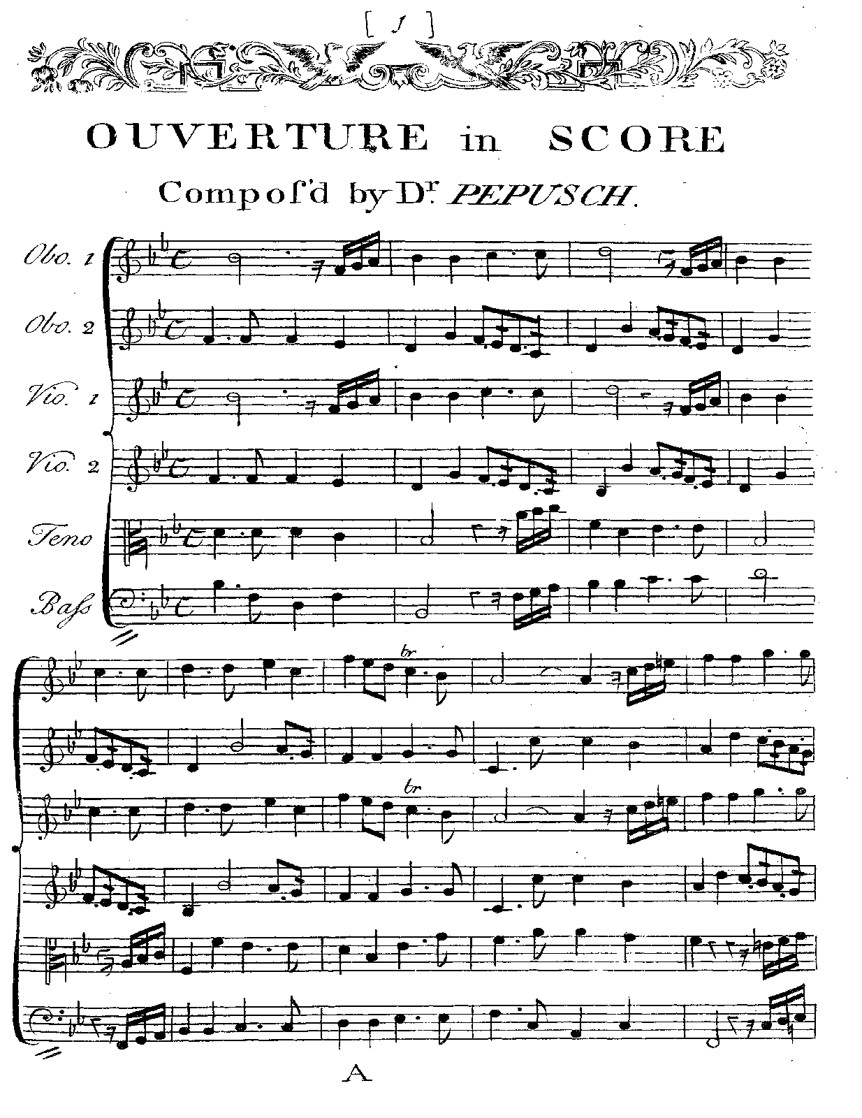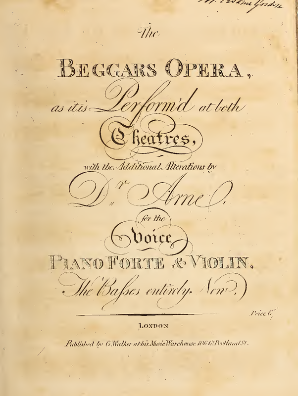 | Extra Information | Pepusch composed the Overture (introducing a few of the song tunes), and harmonised/arranged the song tunes, most of which were popular English ballad tunes of the time. The performance of this was forbidden for a while, because of its political commentary. See The Beggar's Opera: Its Predecessors and Successors. |