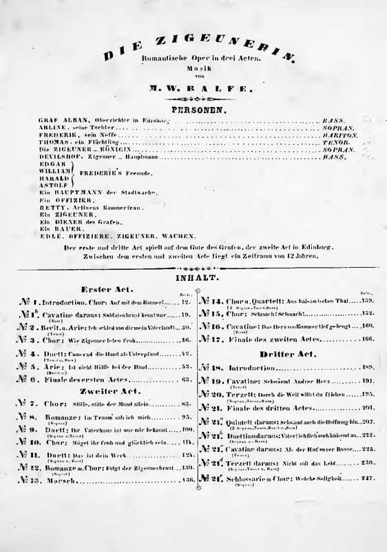 Thaddeus, a Polish fugitive (tenor) Count Arnheim (baritone) Queen of the Gypsies (alto) Devilshoof, chief of the gypsies (bass) Florestein, nephew of the Count (tenor) Buda, Arline's attendant (soprano) Captain of the Guard (bass) Officer (tenor) First Gypsy Second Gypsy