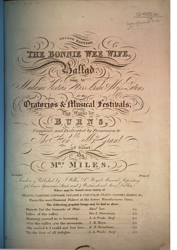 | Alternative. Title | The Bonnie Wee Wife, Ballad. Sung by Madame Vestris, Miss Ashe & Miss Paton, at the Oratorios & Musical Festivals ... composed ... by Mrs. Miles |