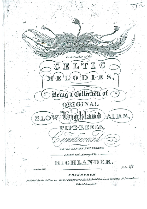 | Alternative. Title | The Celtic Melodies: being a collection of Original Slow Highland Airs, Pipe Reels, and Cainntearachd. Never before published. Selected and Arranged by a Highlander. |