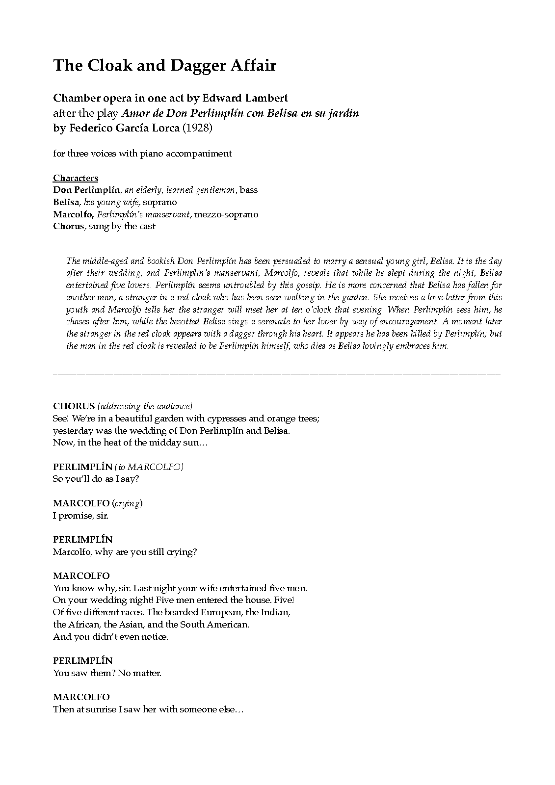The middle-aged and bookish Don Perlimplín has been persuaded to marry a sensual young girl, Belisa. It is the day after their wedding, and Perlimplín’s manservant, Marcolfo, reveals that while he slept during the night, Belisa entertained five lovers. Perlimplín seems untroubled by this gossip. He is more concerned that Belisa has fallen for another man, a stranger in a red cloak who has been seen walking in the garden. She receives a love-letter from this youth and Marcolfo tells her the stranger will meet her at ten o’clock that evening. When Perlimplín sees him, he chases after him, while the besotted Belisa sings a serenade to her lover by way of encouragement. A moment later the stranger in the red cloak appears with a dagger through his heart. It appears he has been killed by Perlimplín; but the man in the red cloak is revealed to be Perlimplín himself, who dies as Belisa lovingly embraces him.