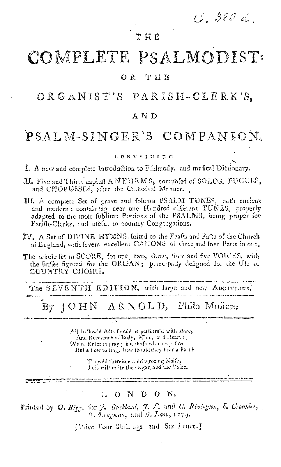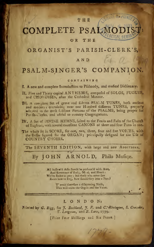 The Compleat Psalmodist: or the Organist's, Parish-Clerk's and Psalm-Singer's Companion ... The whole set in Score, for 1, 2, 3, 4, and 5 Voices, with the Basses figured for the Organ; principally designed for the use of Country Choirs.