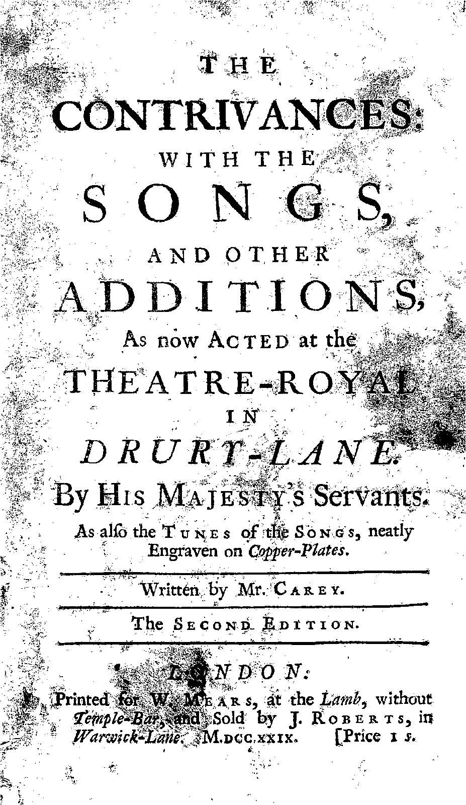 The Songs Duett and Dialogue in the Contrivances wth. their Symphonies & Basses as performed at ye Theatre-Royal in Covent Garden together with ye Symphony & Song Part Transposed for ye German or Common Flute and ye Duett for 2 Flutes