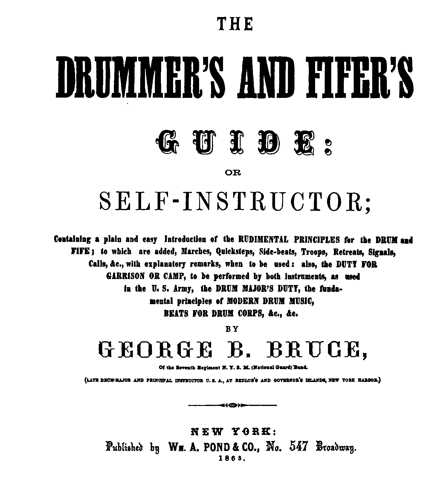 | Alternative. Title | or Self-Instructor; containing a plain and easy introduction of the rudimental principles for the drum and fife; to which are added, marches, quicksteps, side-beats, troops, retreats, signals, calls, &c; with explanatory remarks, when to be used: also, the duty for the garrison or camp, to be performed by both instruments, as used in the U. S. Army, the drum major’s duty, the fundamental principles of modern drum music, beats for drum corps, &c., &ct. |