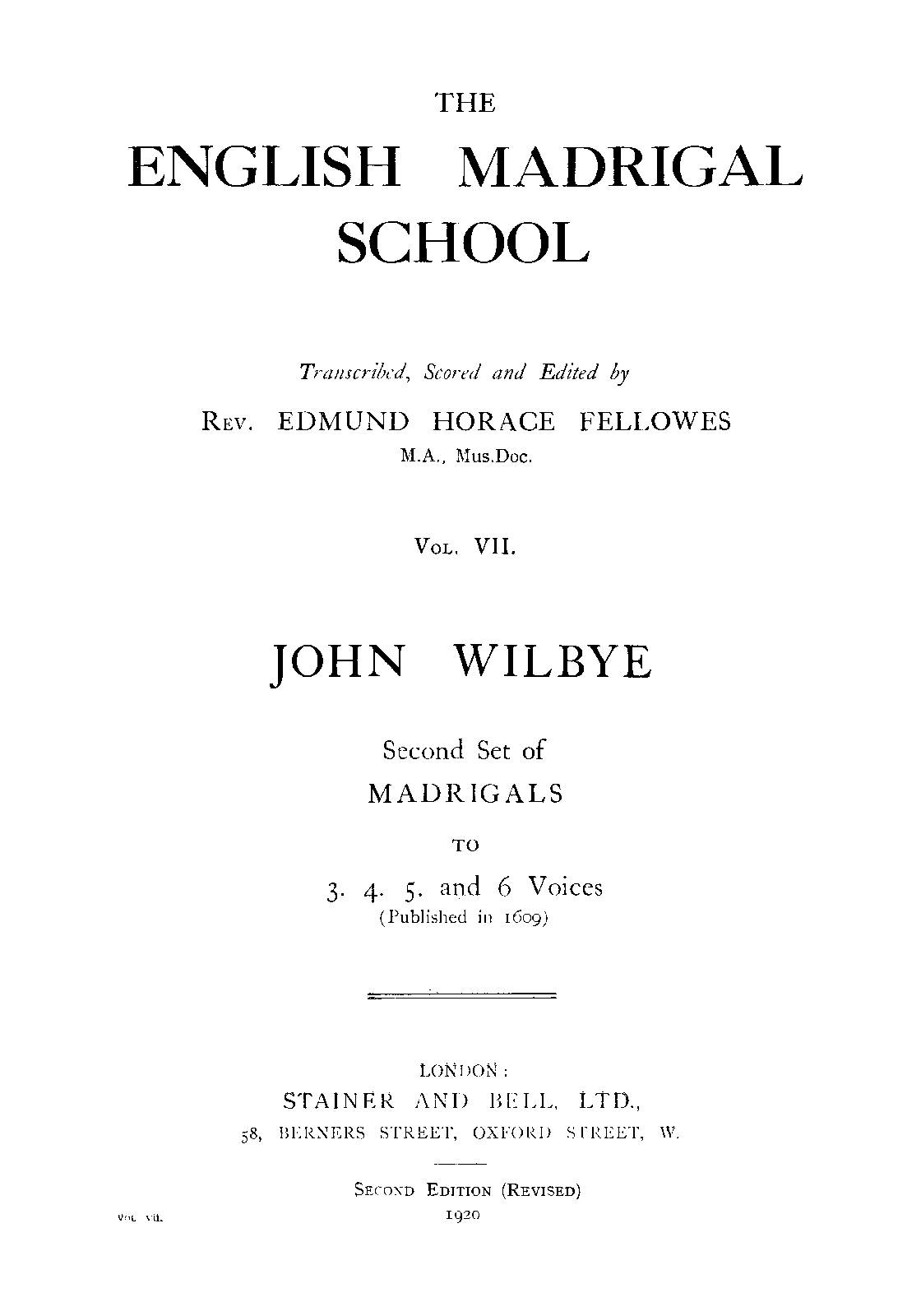 - 5.7 Volume 7 (1914): John Wilbye: Second set of madrigals to 3. 4. 5. and 6 voices (published in 1609)