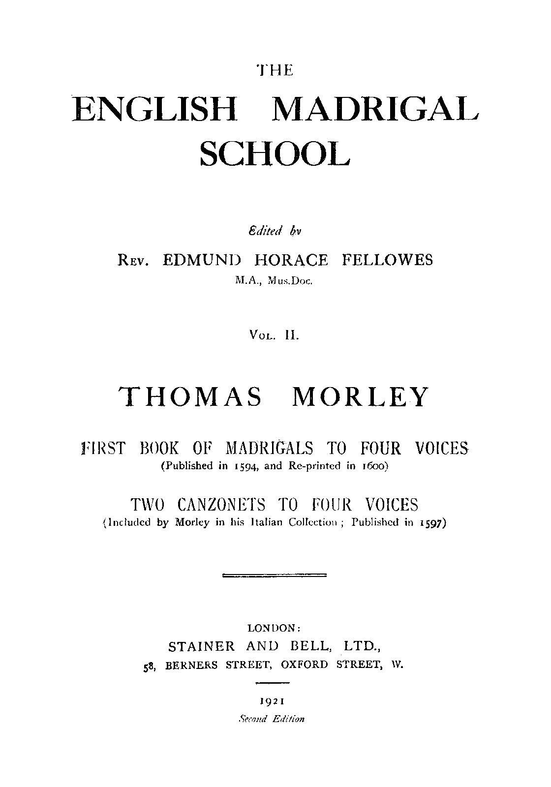 - 5.2 Volume 2 (1913): Thomas Morley: First book of madrigals to four voices (published in 1594, and reprinted in 1600) ; Two canzonets to four voices (included by Morley in his Italian collection; published in 1597)