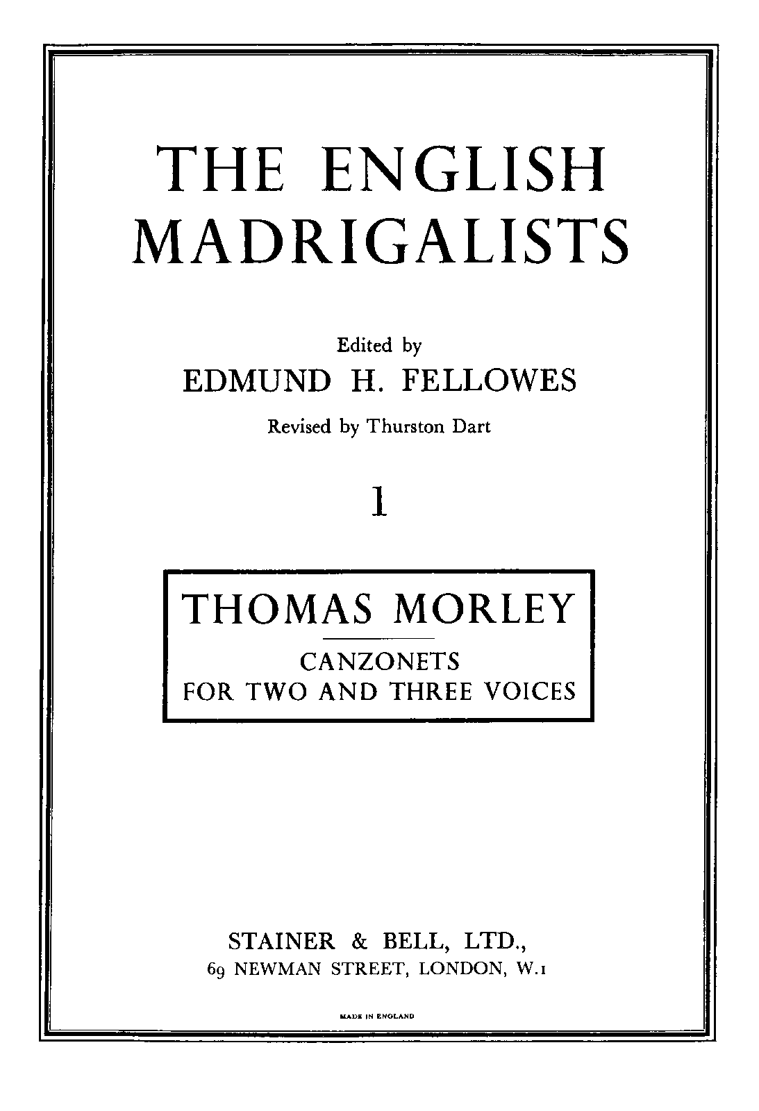 - Thomas Morley (1913): First book of madrigals to four voices (published in 1594, and reprinted in 1600) ; Two canzonets to four voices (included by Morley in his Italian collection; published in 1597)