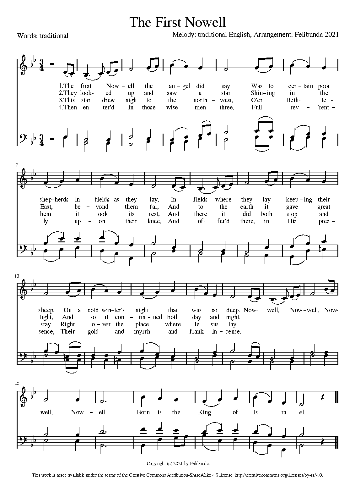 This arrangement of a traditional Christmas carol was written by my, because I wanted to sing this song a capella but an alto voice was missing. The highest voice can be sung by a woman or a man in falsetto. The two lower voices suit a bass and a tenor voice. Please notice that the composition does not strictly follow voice leading rules. Nevertheless in my opinion it is quite nice to sing it with two male and one female voice. Enjoy it *.