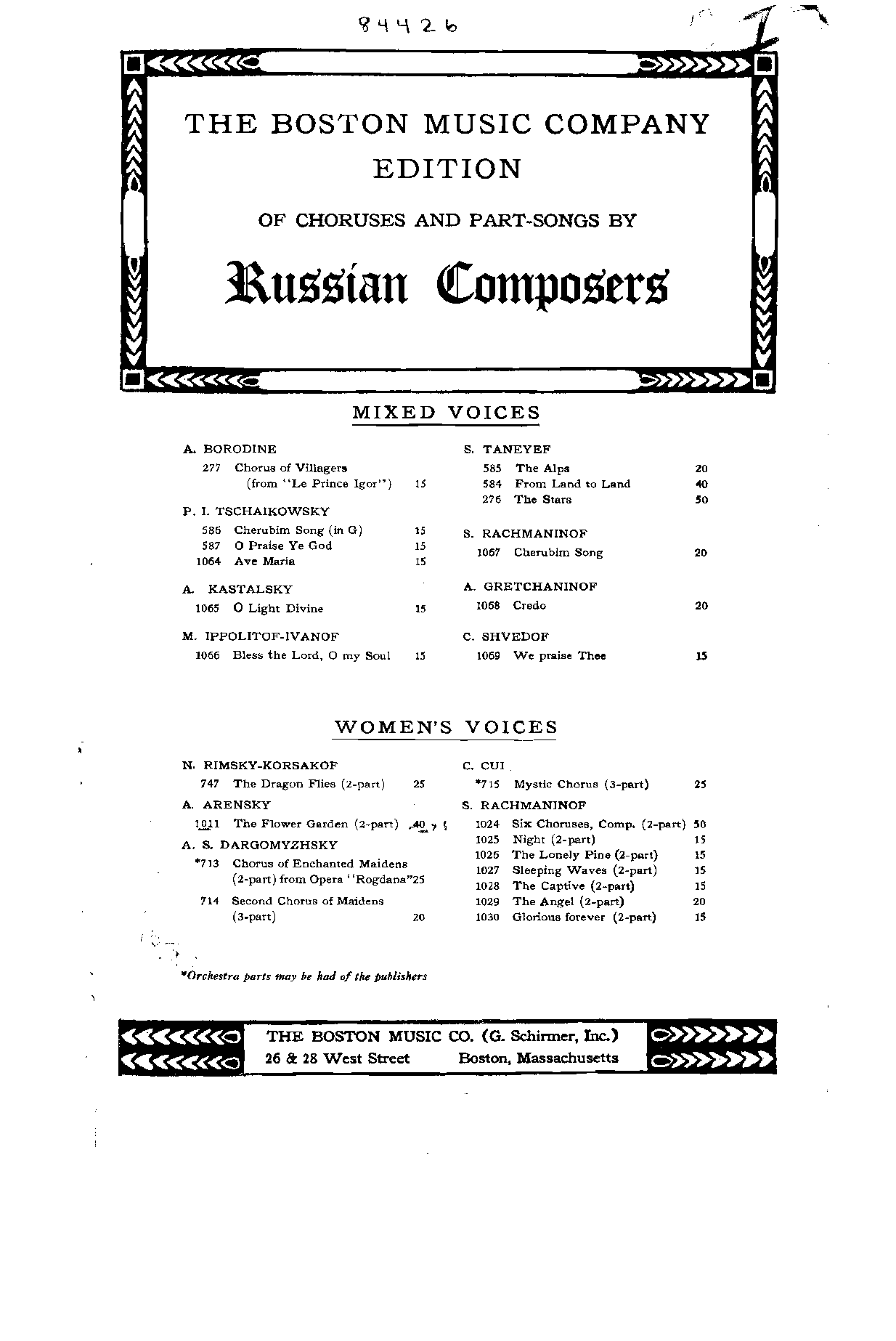 | Genre Categories | Pastorales; For voice, female chorus, piano; For voices and chorus with keyboard; |