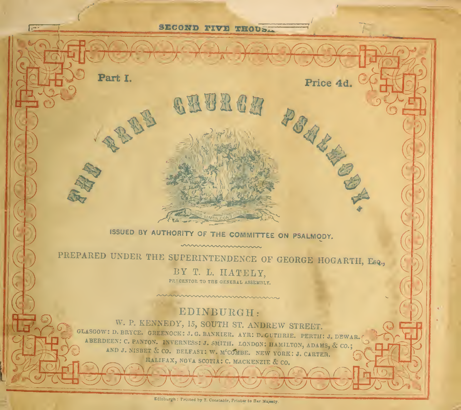 | Alternative. Title | The Psalmody of the Free Church of Scotland. Prepared under the superintendence of George Hogarth, Esq., by T. L. Hately, precentor to the General Assembly. |