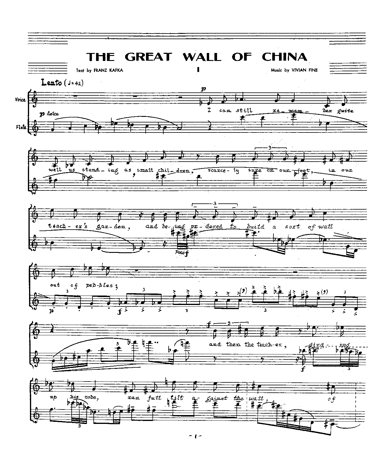 The Great Wall of China…is an impressive composition in which Fine shed any attempt to write tonally. This is Vivian Fine at her best, free to write what she hears. The inspiration for the song came while reading Franz Kafka’s The Great Wall of China. Fine selected passages that attracted her interest and divided the song into four untitled movements….The Great Wall of China is experimental and forward looking in the way she involved the ensemble in portraying the text. Only the third movement uses the full ensemble; Fine never feels compelled to have everyone playing all of the time. The soprano’s text is syllabic and declamatory but set in the twisting modernistic line of her earlier music. At times she narrates with a spoken line but never is the text distorted….Fine does not use sprechstimme or any extended vocal techniques. Rather it is the total texture that conveys meaning.