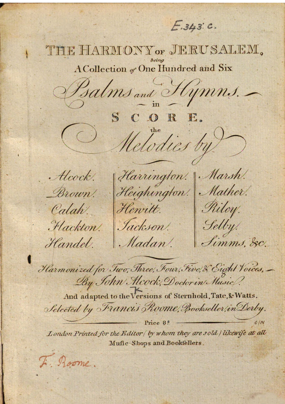 | Alternative. Title | The Harmony of Jerusalem, being a Collection of One Hundred and Six Psalms and Hymns in Score. the Melodies by Alcock, Brown, Calah, Flackton, Handel, Harrington, Heighington, Hewitt, Jackson, Madan, Marsh, Mather, Riley, Selby, Simms, &c. Harmonized for Two, Three, Four, Five & Eight Voices, by John Alcock, Doctor in Music. And adapted to the Versions of Sternhold, Tate, & Watts. Selected by Francis Roome, Bookseller, in Derby |