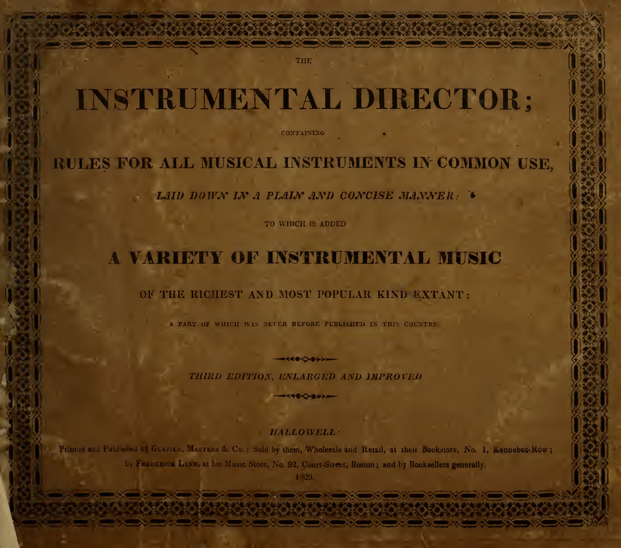 - Instructions (brief method and fingering charts, some exercises) for: German Flute, Patent Flute, Clarionet, Bassoon, Serpent without keys, Serpent with keys, French Horn, Kent Bugle (i.e. six-keyed bugle), Bugle, Trumpet, Flagelet, Hautboy (oboe), Violin, Viola or Tenor Viol [sic], Violoncello or Bass Viol [sic], Double Bass, Trombone, Percussion (Cymbals, Tambourine, Triangle, Bass Drum)
