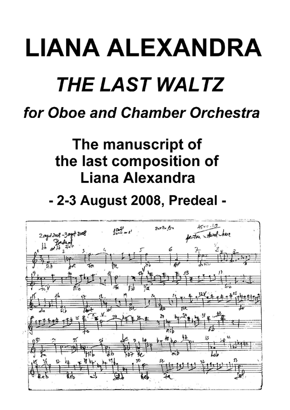 The last composition of Liana Alexandra. In this YouTube video testament (recorded at home, in 2006) , and in her last interview (November 2010) Liana Alexandra says: I am deeply disappointed by the malice of my Romanian colleagues. I not have imagined that meet some evils - envy - so large that some can be paid with the lives, physically ... On January 9, 2011 Liana Alexandra suffered a fatal brain hemorrhage. Her musical creations are maintained at the Romanian Academy and at the Library of Congress in the United States.