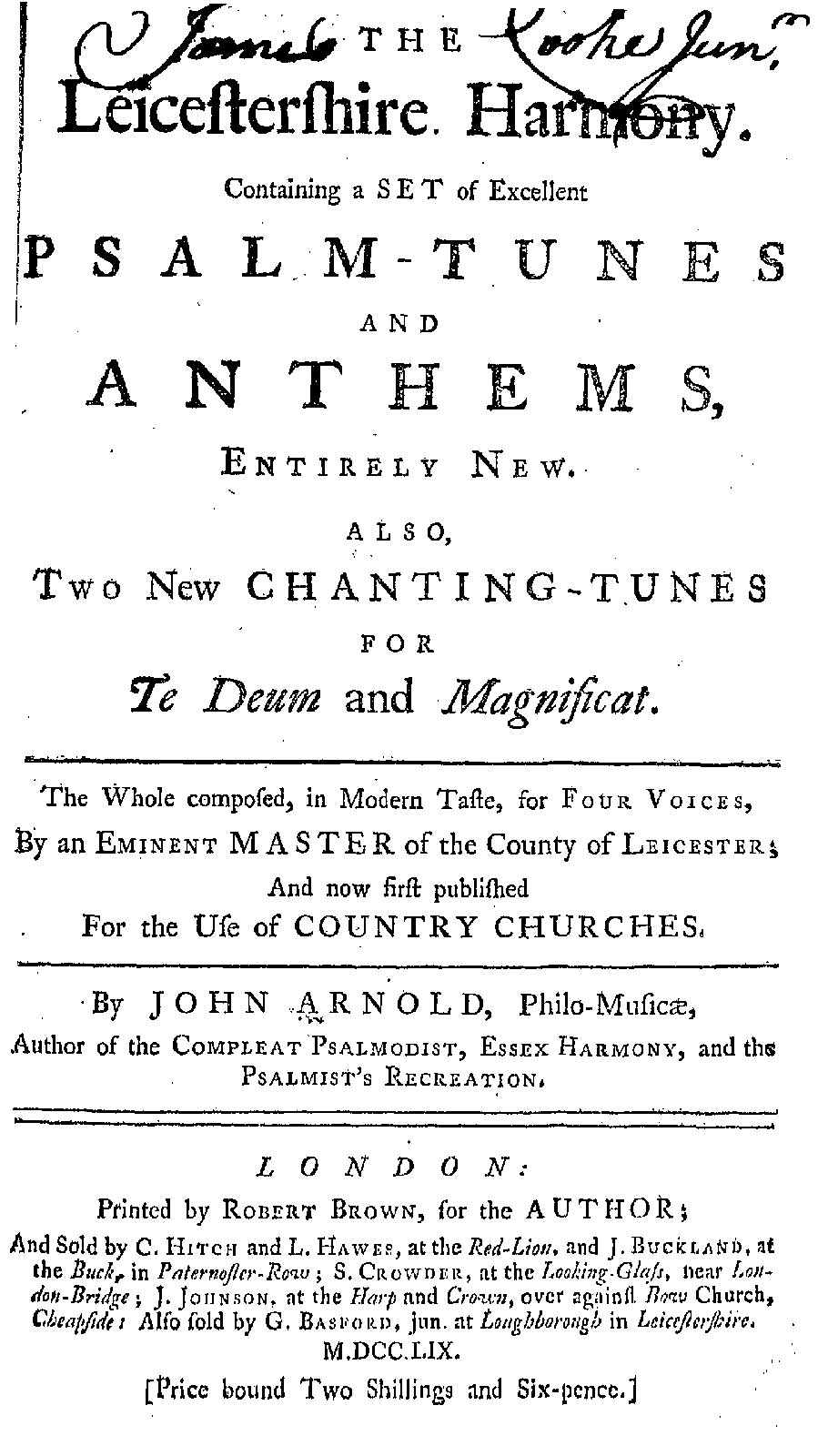 | Alternative. Title | Title-page transcription The Leicestershire Harmony. Containing a Set of Excellent Psalm-Tunes and Anthems, Entirely New. Also Two New Chanting-Tunes for Te Deum and Magnificat. The Whole composed, in Modern Taste, for Four Voices, By an Eminent Master of the County of Leicester; And now first published For the Use of Country Churches.</span> |