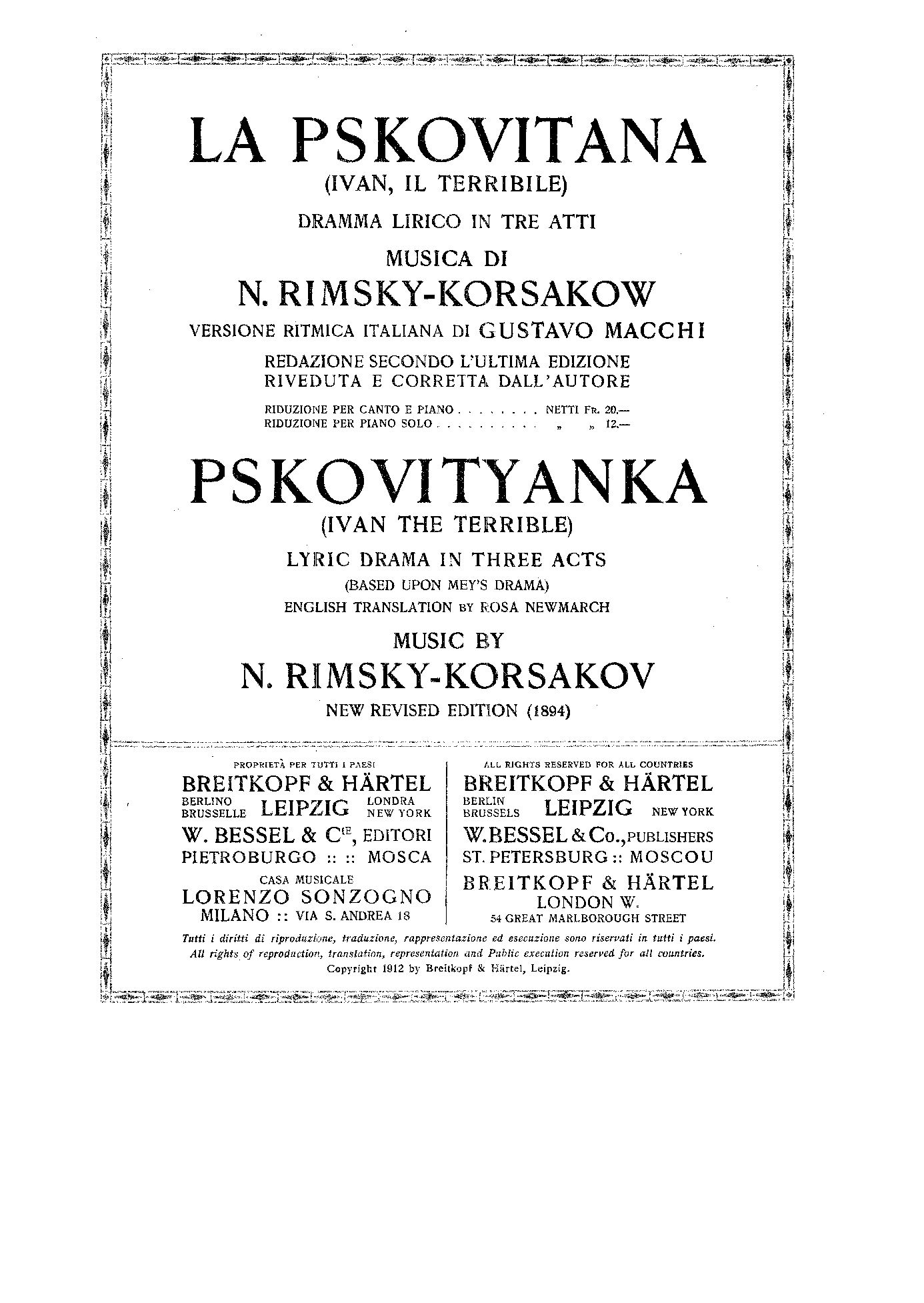 Псковитянка; La Pskovitaine; Псков'янка; La donzella de Pskov; La fanciulla di Pskov; La dama de Pskov; A pszkovi lány; La ragasóla 'd Pskov; プスコフの娘; Pskovanino; 普斯科夫的女子; Flickan från Pskov; Das Mädchen von Pskow; "Псковитянка"; המשרתת מפסקוב