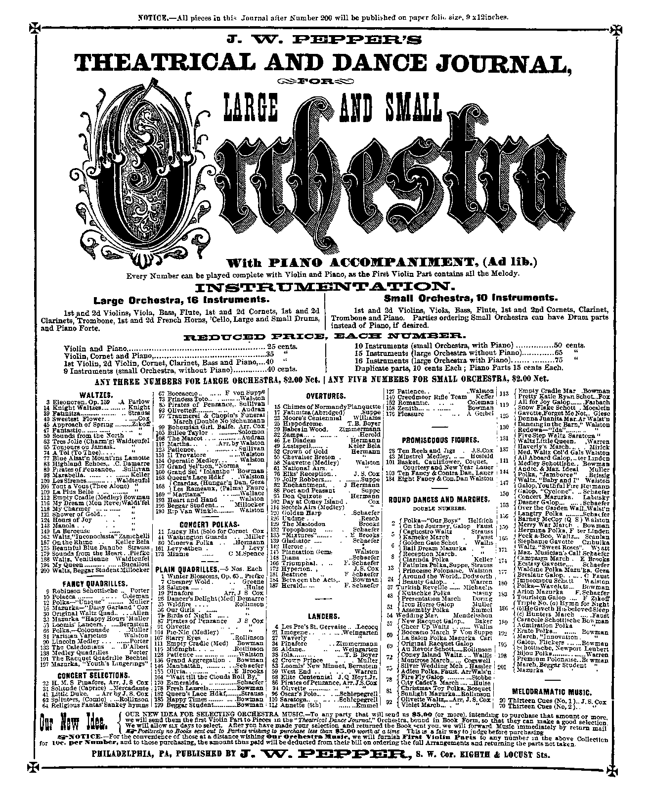 As published the work could be performed by an orchestra consisting of first and second violins, viola, bass, flute, clarinet, first and second cornets, trombone, and piano.
