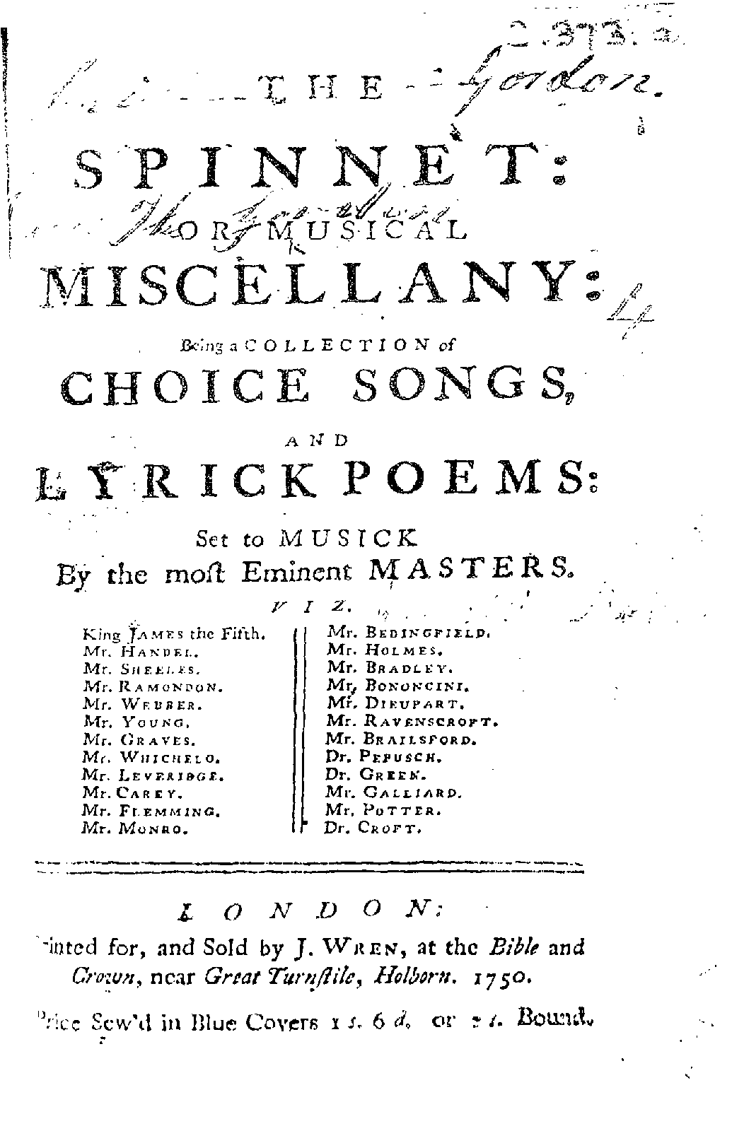 Published separately under the title The Spinnet, or Musical Miscellany, Being a Collection of Choice Songs, and Lyrick Poems: Set to Musick by the most Eminent Masters. Includes an interesting early version of Auld lang syne. A large number of songs by John Sheeles.