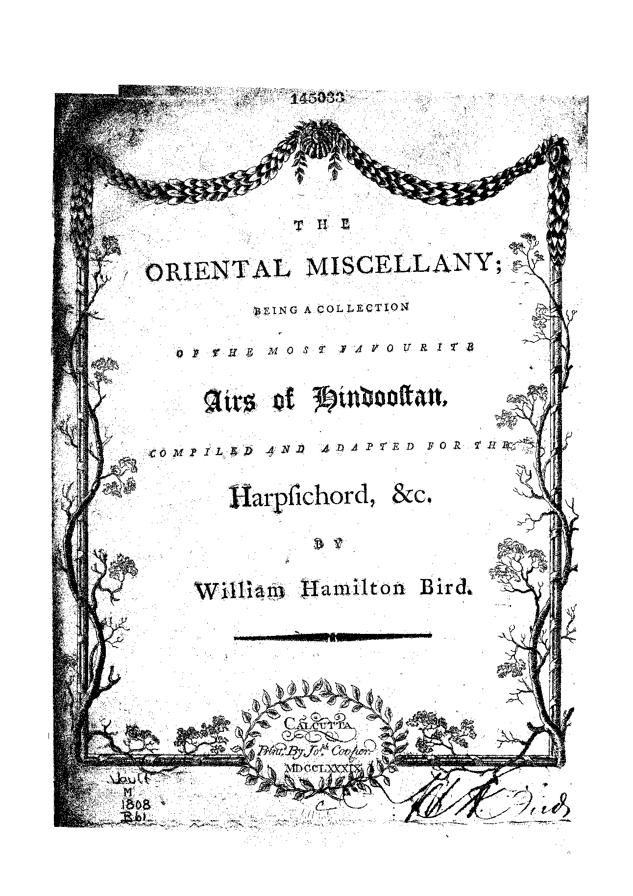 - The oriental miscellany : being a collection of the most favourite airs of Hindoostan, compiled and adapted for the Harpsichord, &c. 30 Hindustani Airs, plus Sonata, Minuetto, Jigg, and a selection of the airs arranged for 'guitar' (i.e. English Guitar/cittern)</span>
