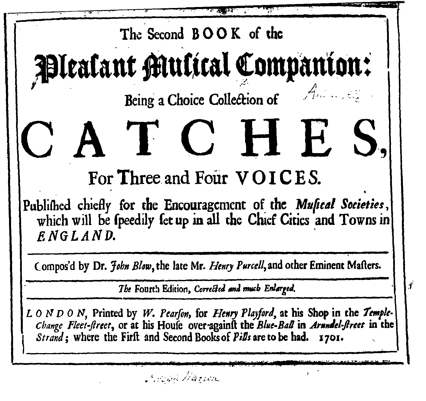 The pleasant musical companion; being a choice collection of catches, for three and four voices. Compos'd by Dr. John Blow, the late Mr. Henry Purcell and other eminent masters
