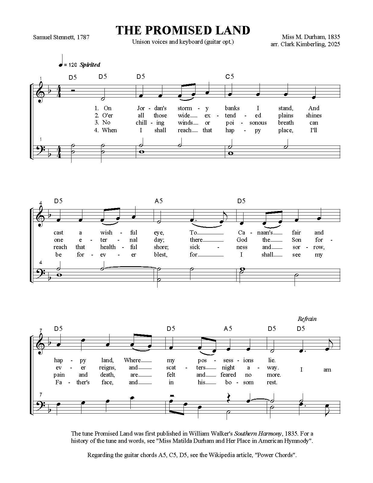 | Extra Information | Arrangement (2025) of "The Promised Land" by Matilda Durham, in William Walker's collection, Southern Harmony, 1835. |