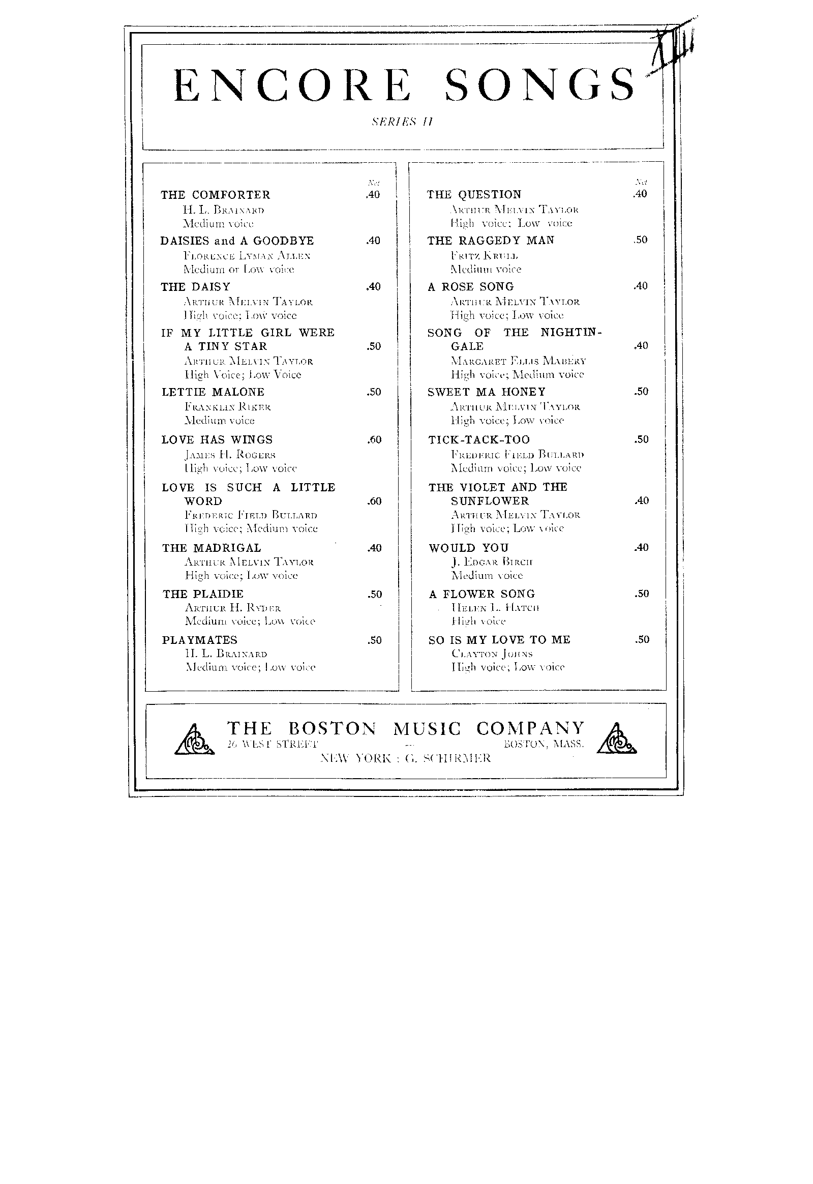 | Genre Categories | Songs; For voice, piano; For voices with keyboard; |