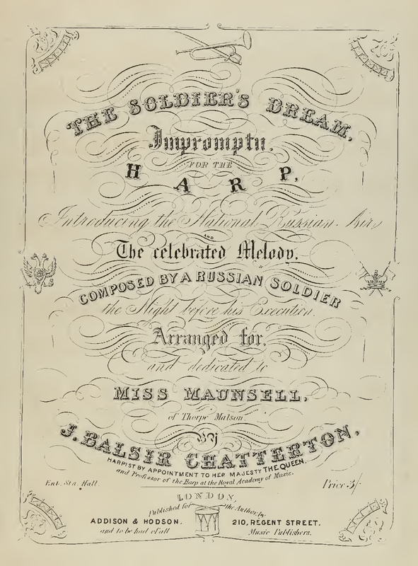 | Alternative. Title | The Soldier's Dream, Impromptu, for the harp, Introducing the national Russian air and the celebrated melody composed by a Russian soldier the night before his execution. |