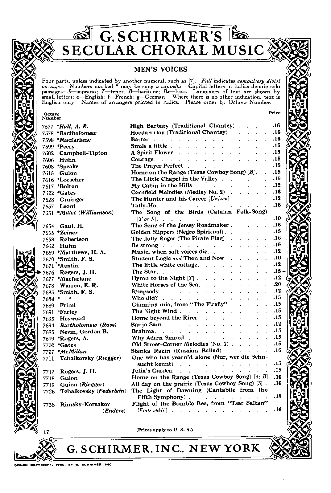 G. Schirmer's Secular Choral Music, No.7676 New York: G. Schirmer, 1933. Plate 35925.